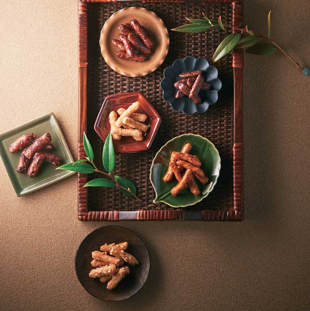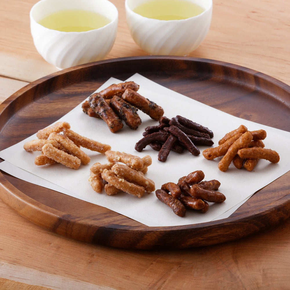 ■サクサクッとした食感に仕上げたハチミツ入り黒糖かりんとう、ピーナッツの香ばしさと甘みが調和したピーナッツかりんとう、牛乳を生地に練り込んだ牛乳かりんとう、香ばしい黒ごまで仕上げた黒ごまかりんとう、チョコレートを生地にたっぷりとねりこみカリっと軽い食感に仕上げたチョコかりんとう、キャラメルをたっぷりとかけしっとりと仕上げたキャラメルかりんとう。6種類のフレーバーを楽しめるかりんとう詰合わせです。