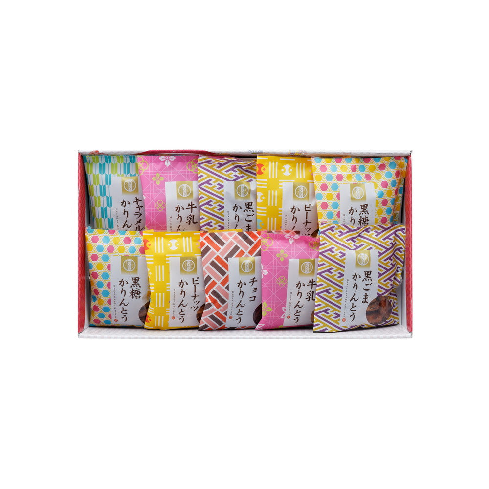 ■商品内容:黒ごまかりんとう45g×2個、黒糖かりんとう45g×2個、牛乳かりんとう45g×2個、ピーナッツかりんとう45g×2個、チョコかりんとう45g×1個、キャラメルかりんとう45g×1個