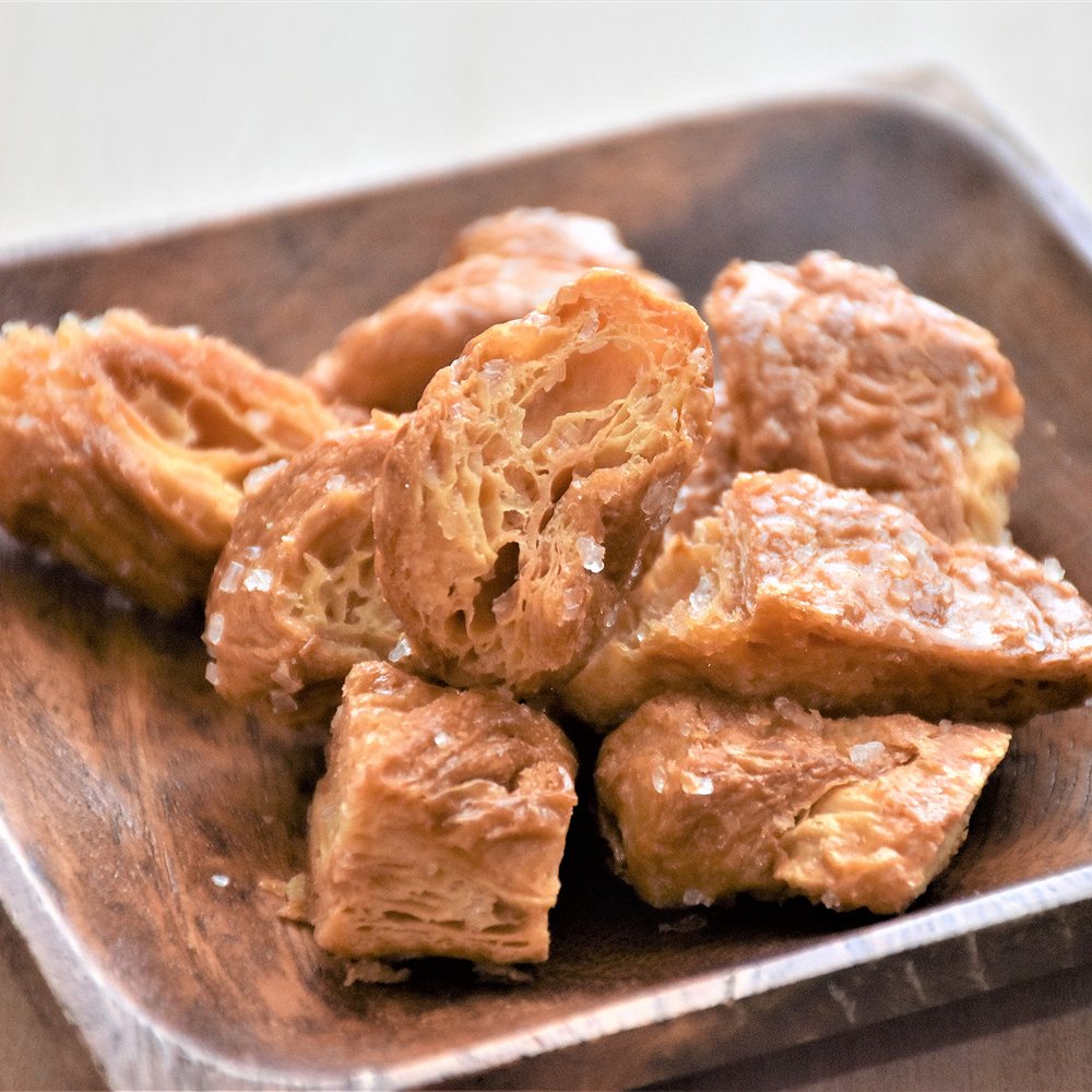 ■層になったクロワッサンに、ザクザク食感が心地よいザラメ糖を絡め、優しい甘さのラスクに仕上げました。
