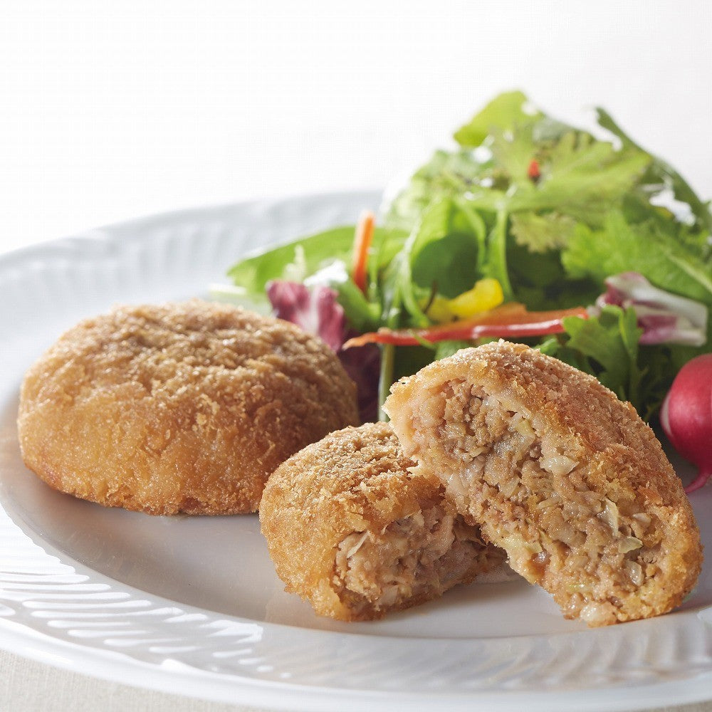 豚肉と野菜をふんだんに混ぜ込んだメンチカツです。食べたときに口いっぱいに広がる旨みと甘み、ジューシィな肉汁とふんわりした食感は、宮崎県都城市のブランド豚「観音池ポーク」と地場野菜のハーモニーがなせるワザです。電子レンジであたためるだけでお召しあがりいただけます。