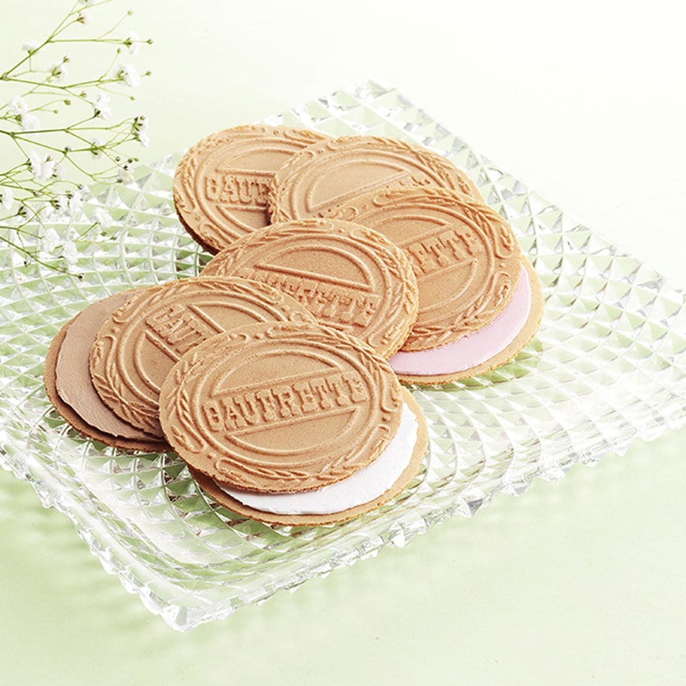 ■風月堂が独自に開発したゴーフルを美味しさそのままに食べやすく小型にしました。 サクサクに香ばしく焼き上げた欧風煎餅に、バニラ・チョコレート・ストロベリーの 3種クリームをサンドした、どなたにも好まれる伝統の銘菓です。