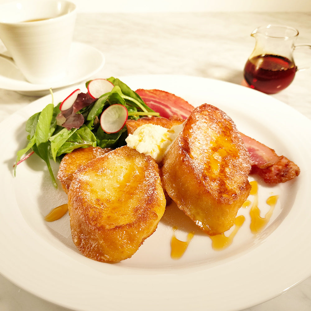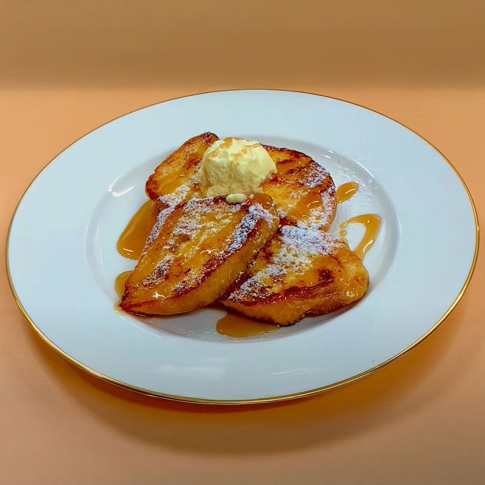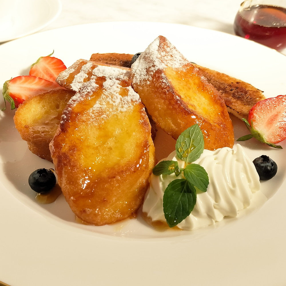 ■フランスパンに卵、牛乳、生クリームを使用したアパレイユ(卵液)をしっかりと染み込ませて一度熱を通すことでしっとりした食感に。更ににお召し上がりの前に焼き目を付けることで外はカリっと香ばしいフレンチトーストに仕上がります。