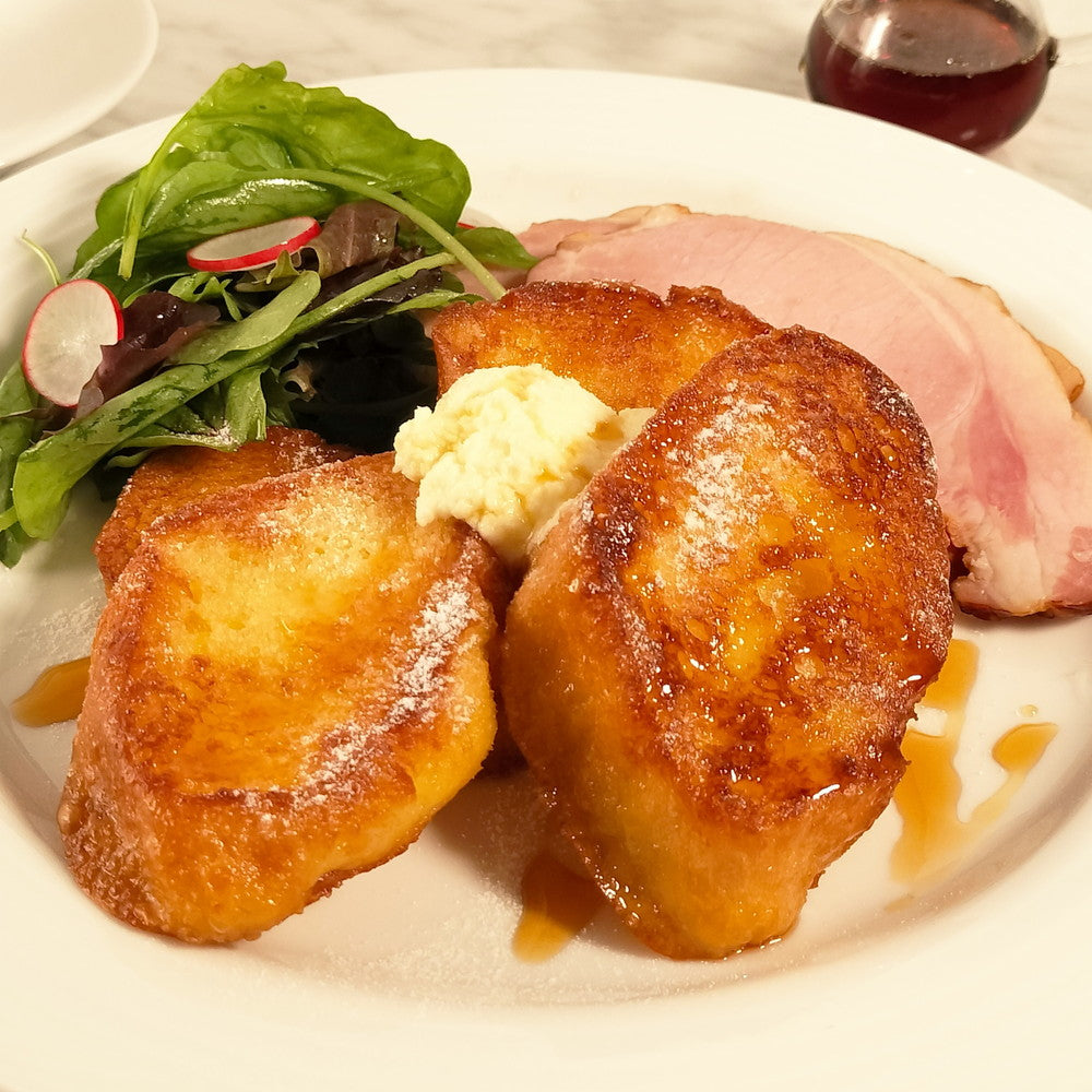 ■フランスパンに卵、牛乳、生クリームを使用したアパレイユ(卵液)をしっかりと染み込ませて一度熱を通すことでしっとりした食感に。更ににお召し上がりの前に焼き目を付けることで外はカリっと香ばしいフレンチトーストに仕上がります。