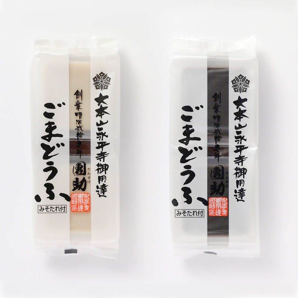 770年以上ある歴史と伝統を受け継いでいる禅の道場 曹洞宗大本山永平寺。精進料理の代表格として、永平寺に受け継がれてきた團助の胡麻豆腐は、良質のごまと葛粉を丹念に練って作られています。香ばしい風味となめらかな舌ざわりの「白ごまどうふ」と、ねっとりした舌ざわりで濃厚な味わいが魅力の「黒ごまどうふ」の詰合せです。