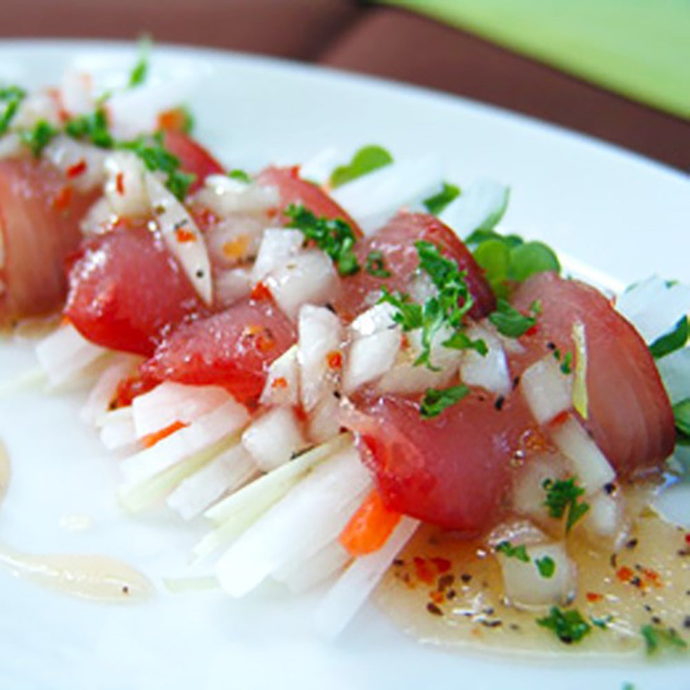 まぐろを生ハムに仕立て、スライスしました。しっとりとした食感に燻の薫りが広がります。 オードブル感覚でお召し上がりください。