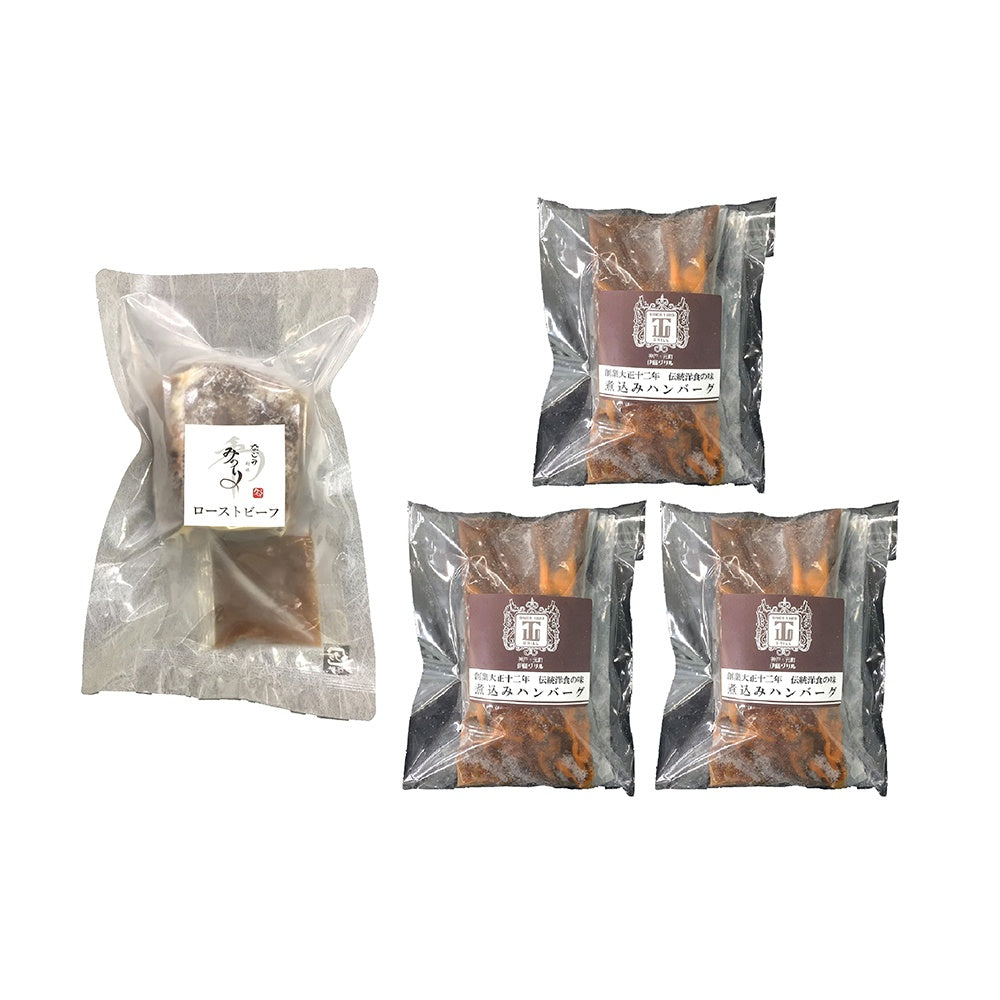 ■内容量:【みのり】ローストビーフ300g、山椒ソース30g【伊藤グリル】煮込みハンバーグ200g(固形量120g)×3