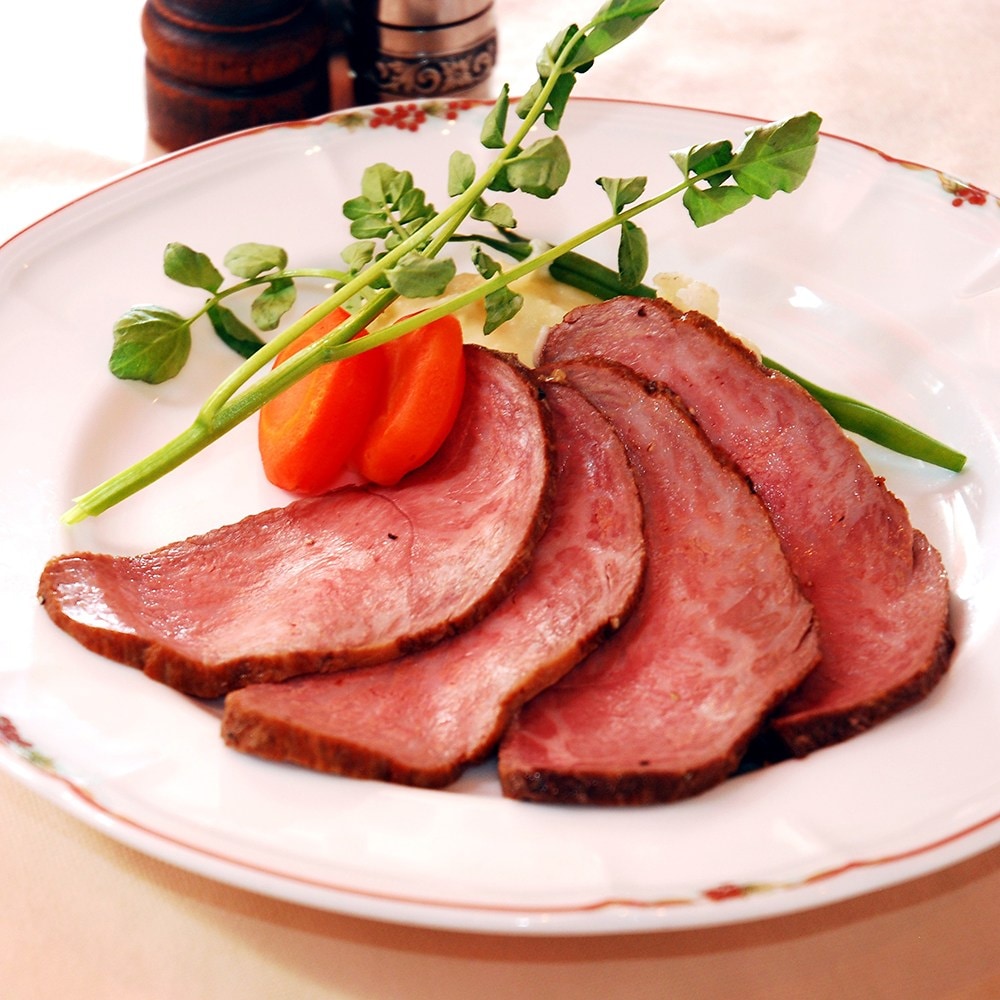 創業大正12年、神戸で愛され続ける老舗洋食店「伊藤グリル」の創業当時から愛されるデミグラスソースに赤ワインを加えたソースで味わう、芳醇な味わいの黒毛和牛ローストビーフ。適度な脂の入った赤身肉(モモ肉)を真空調理することで、肉の旨みが逃げず肉の濃厚な旨みとジューシーでやわらかな食感が楽しめます。