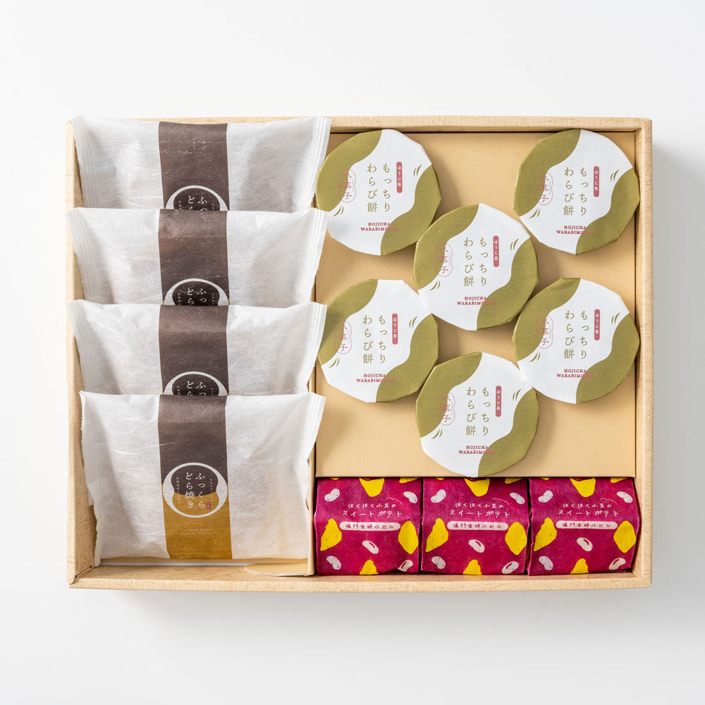 ■商品内容:ふっくらどら焼き×4個、もっちりわらび餅×6個、ほくほく小豆のスイートポテト×3個 計13個入り