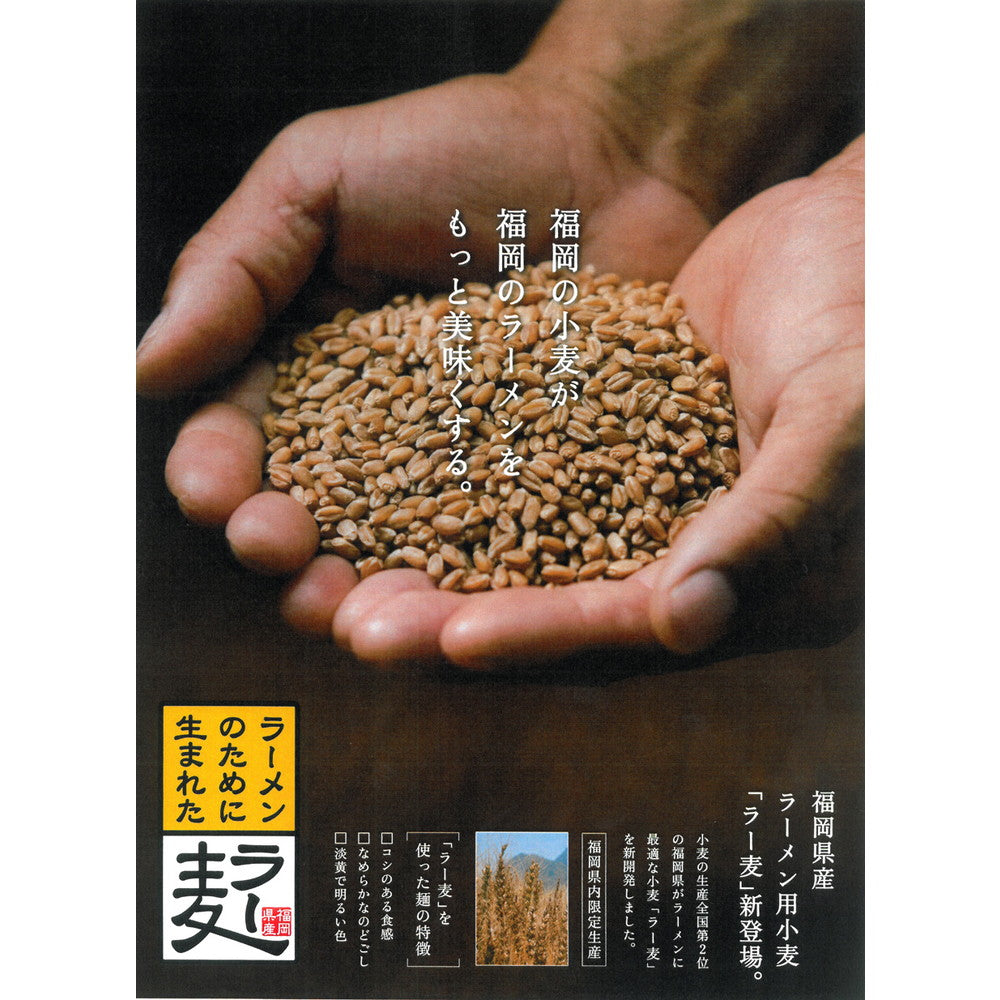 ■福岡県が5年の歳月を掛けて開発したラーメン専用小麦「ラー麦」を100%使用し、ストロンガー製法(間接蒸気乾燥)により麺の表面を固化させコシのある食感と滑らかなのどごし、淡黄で明るい色が特徴の麺に仕上げじっくり煮込んだ豚骨スープをセットしました。