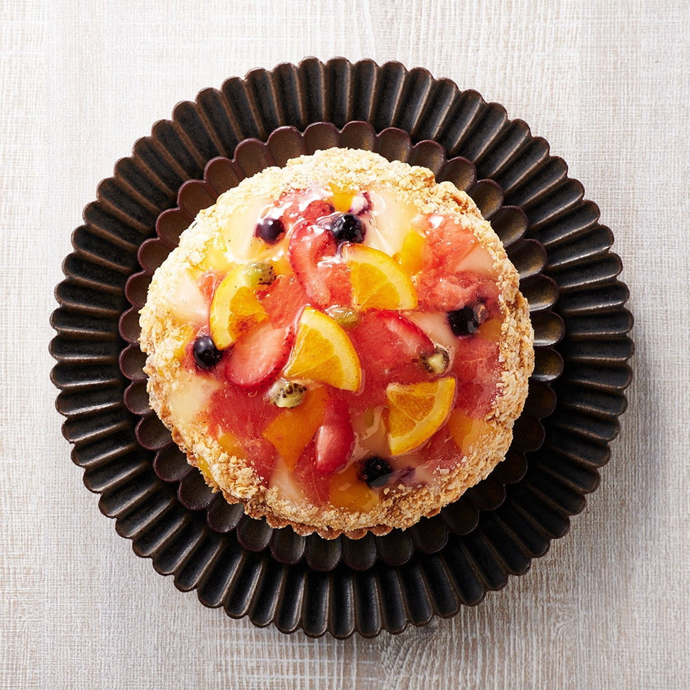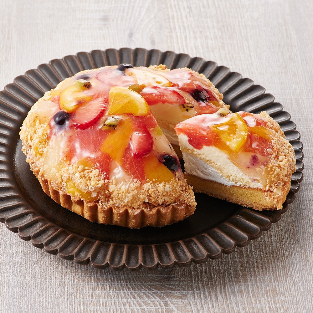 ■7種類のフルーツ(苺、黄桃、洋梨、オレンジ、キウイ、ピンクグレープフルーツ、ブルーベリー)をたっぷりと贅沢に盛り付けサクサクのパイを側面に散りばめたフルーツタルトです。