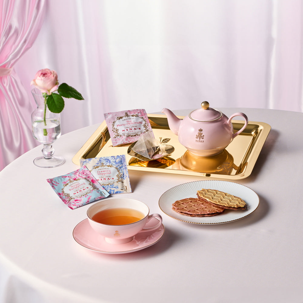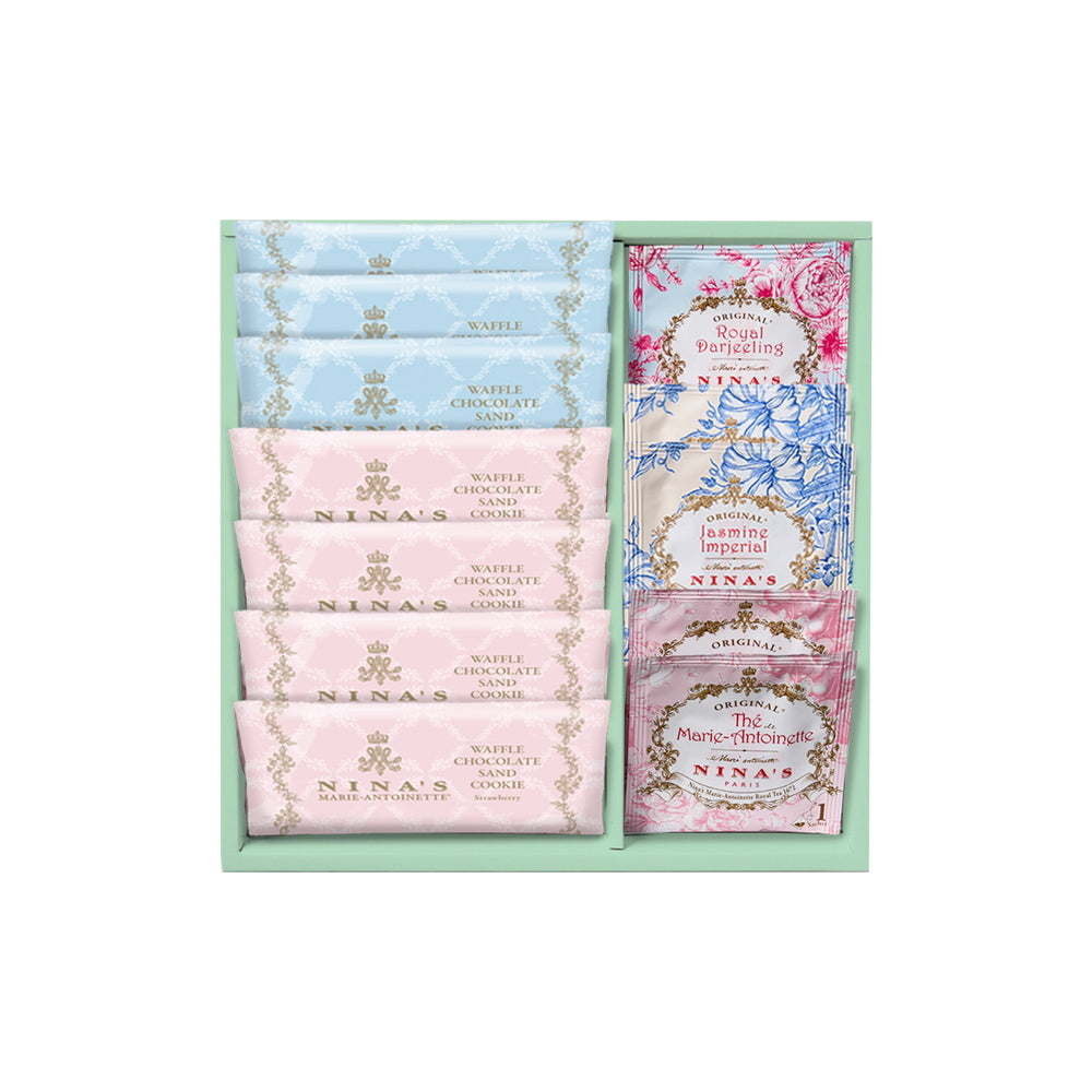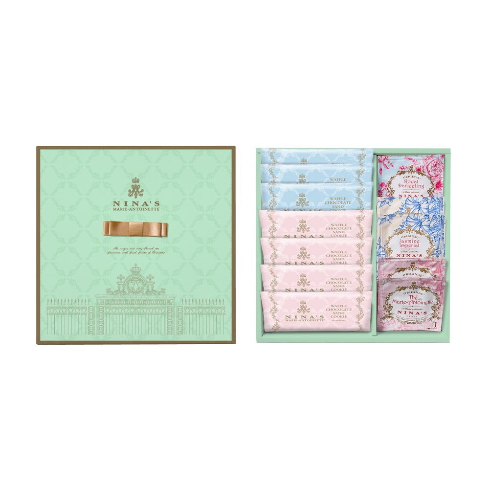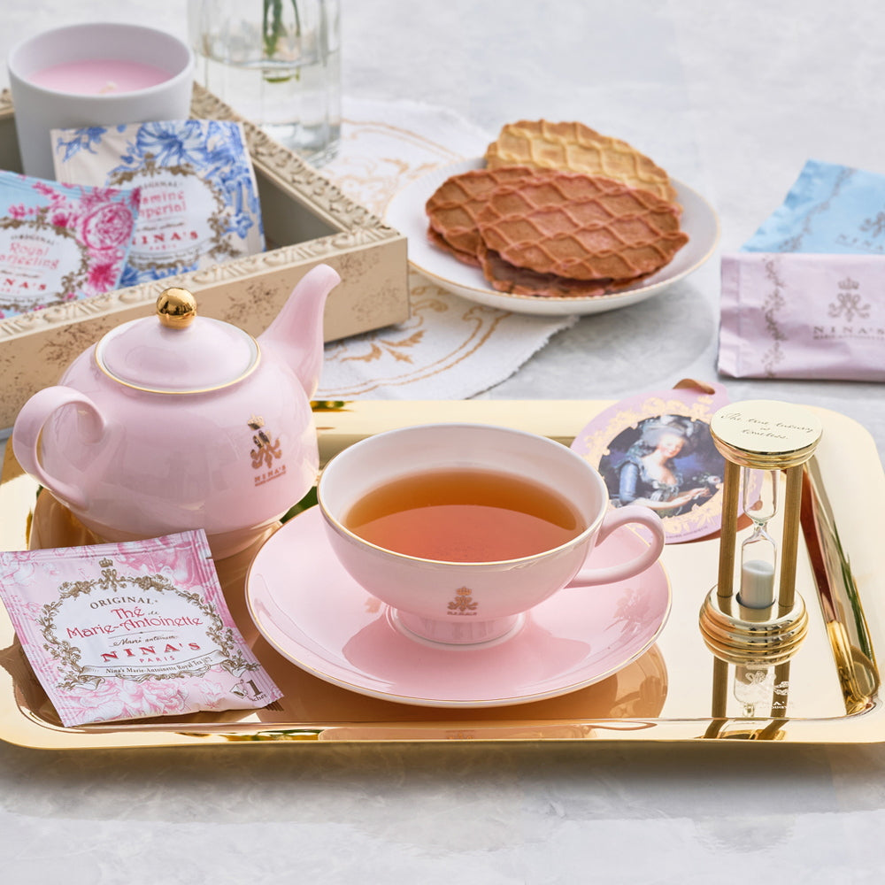 ■王妃マリー・アントワネットのラグジュアリー・ティーをイメージしたニナスの紅茶と、チョコレートをサンドした香ばしいワッフルクッキーをセットでお届けします。