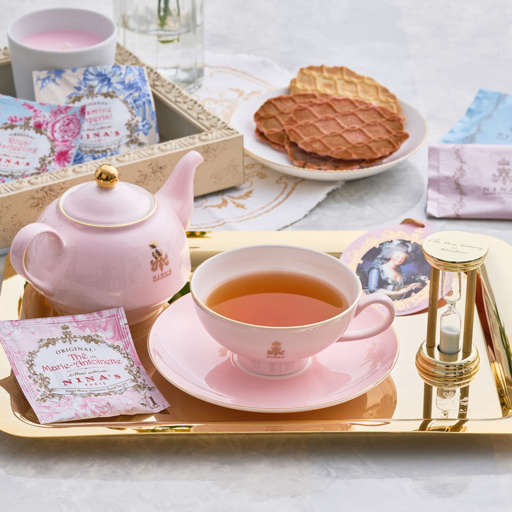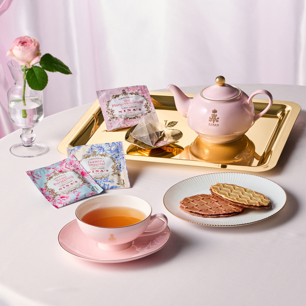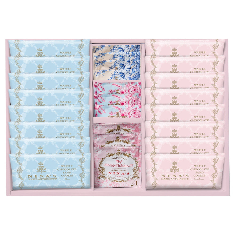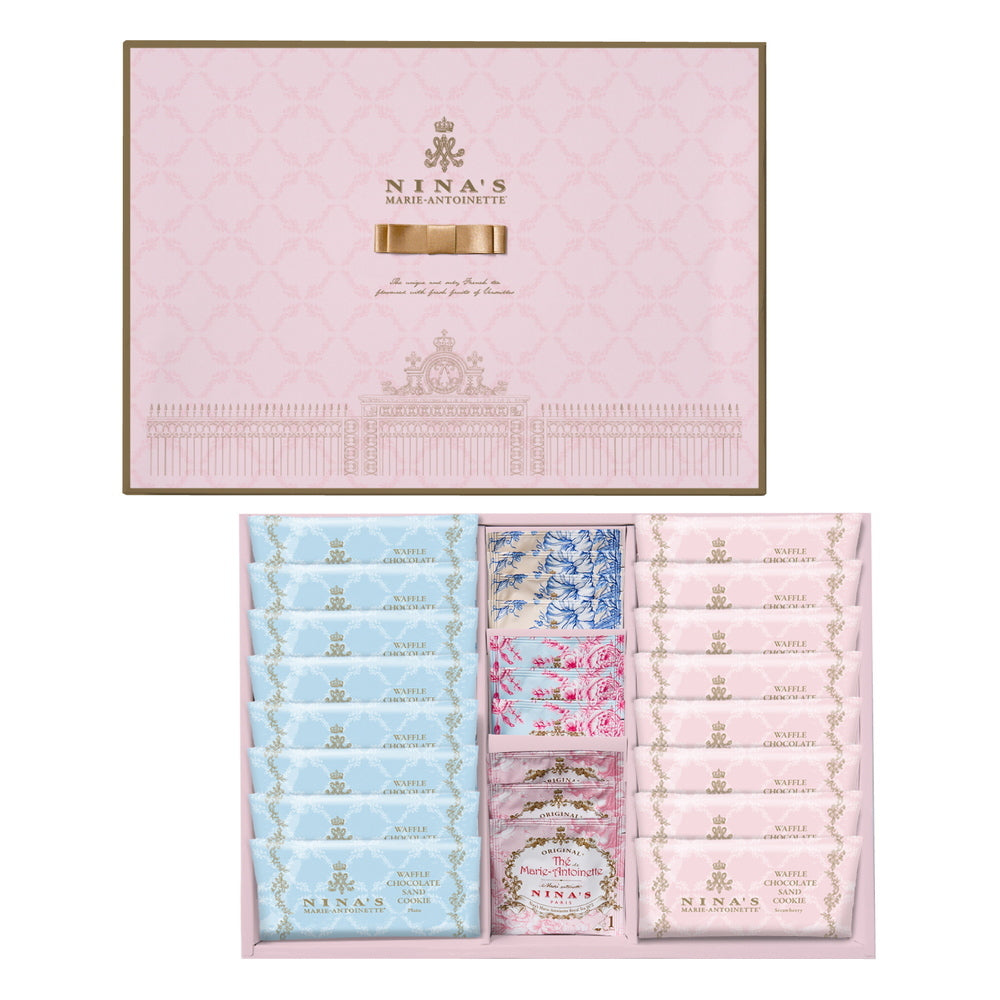 ■王妃マリー・アントワネットのラグジュアリー・ティーをイメージしたニナスの紅茶と、チョコレートをサンドした香ばしいワッフルクッキーをセットでお届けします。