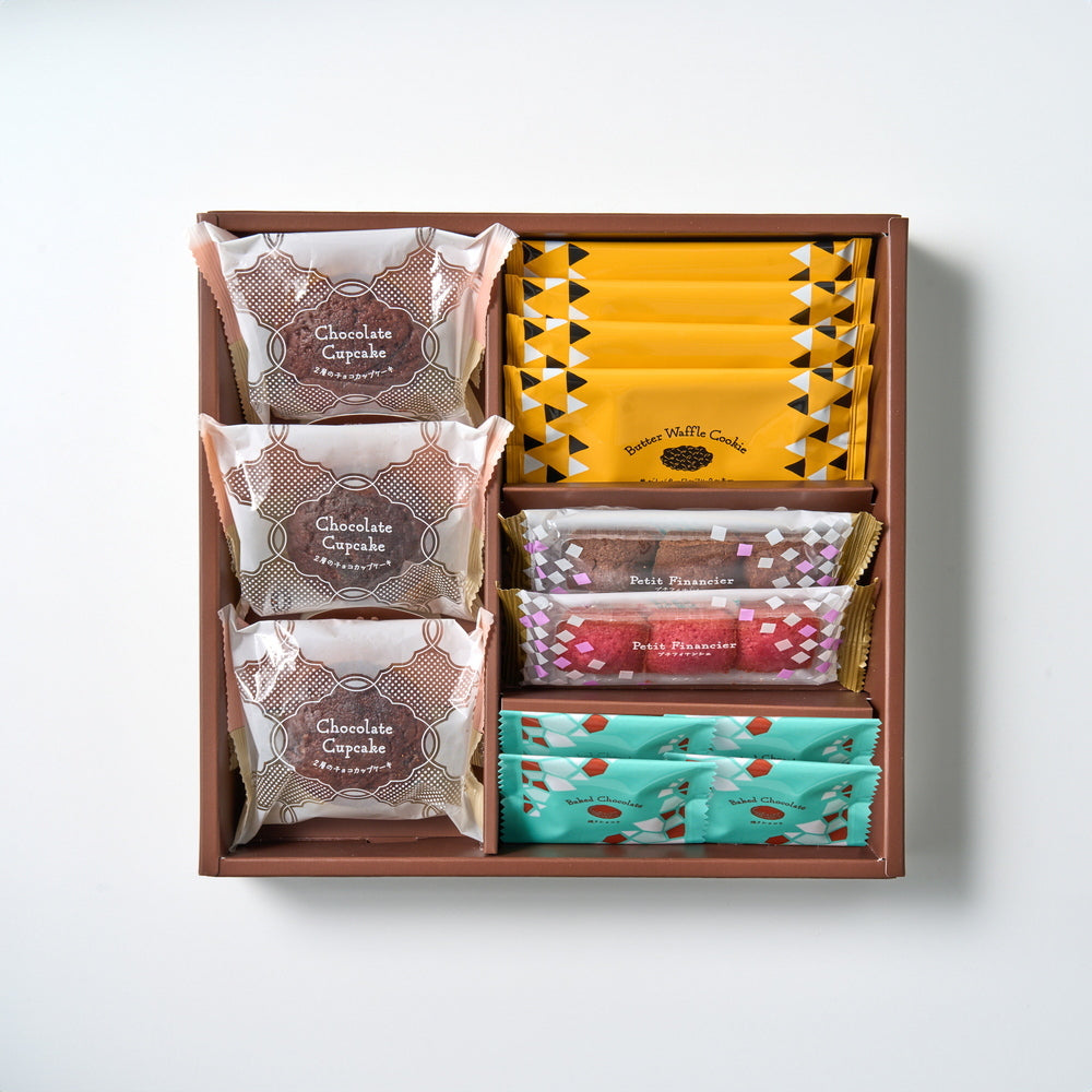 2層のチョコカップケーキ×3個、焼きショコラ×4個、焦がしバターワッフルクッキー×4枚、プチフィナンシェ(ショコラ・フランボワーズ)×各1袋(3個入)