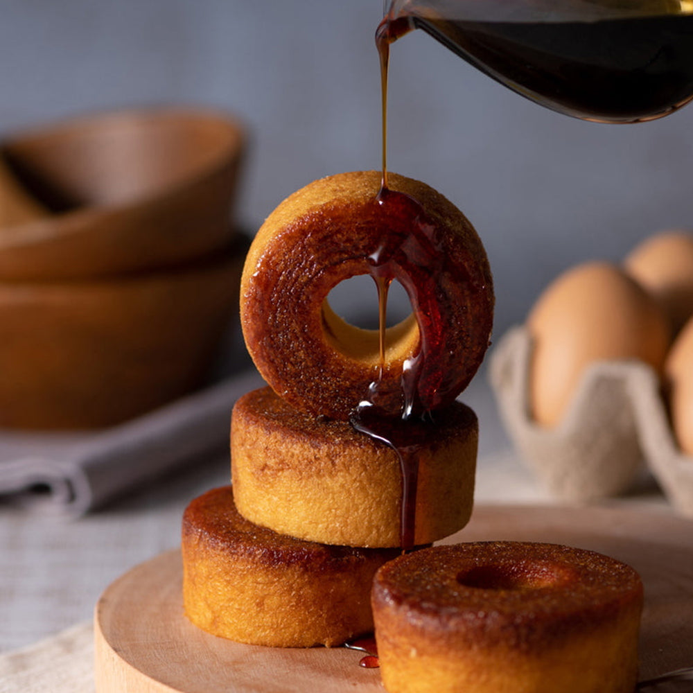 ■しっとりバームクーヘンにカラメルソースをまとわせ、砂糖をかけてさらに焼き上げました。ひと手間かけた贅沢なバームクーヘンです。プチサイズで食べやすく、しっかりとしたキャラメル風味が楽しめるアイテムです。