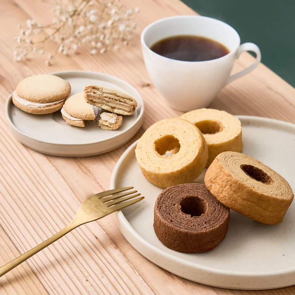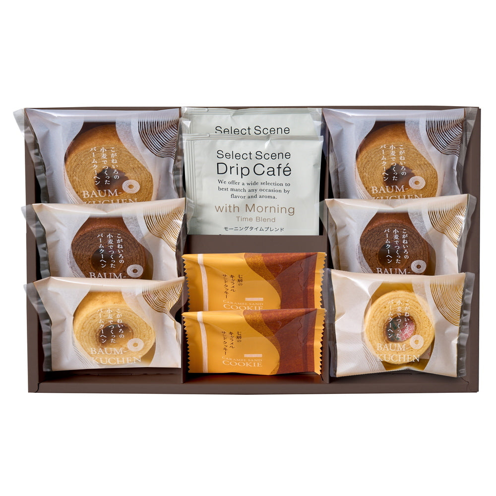 ふんわりバームクーヘン(ミルク・ココア・黒糖×各2個)七層のキャラメルサンドクッキー×2個、三喜屋珈琲のレギュラーコーヒー×2袋