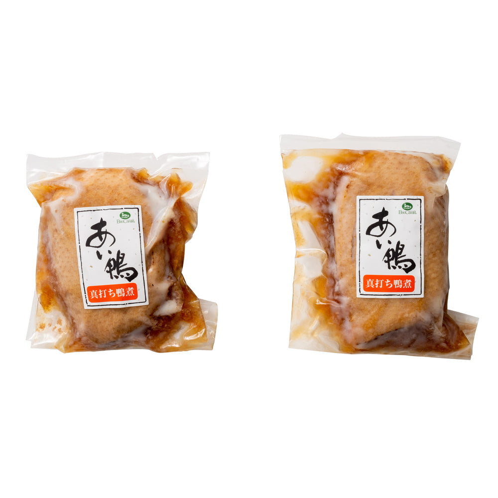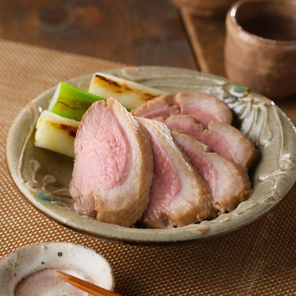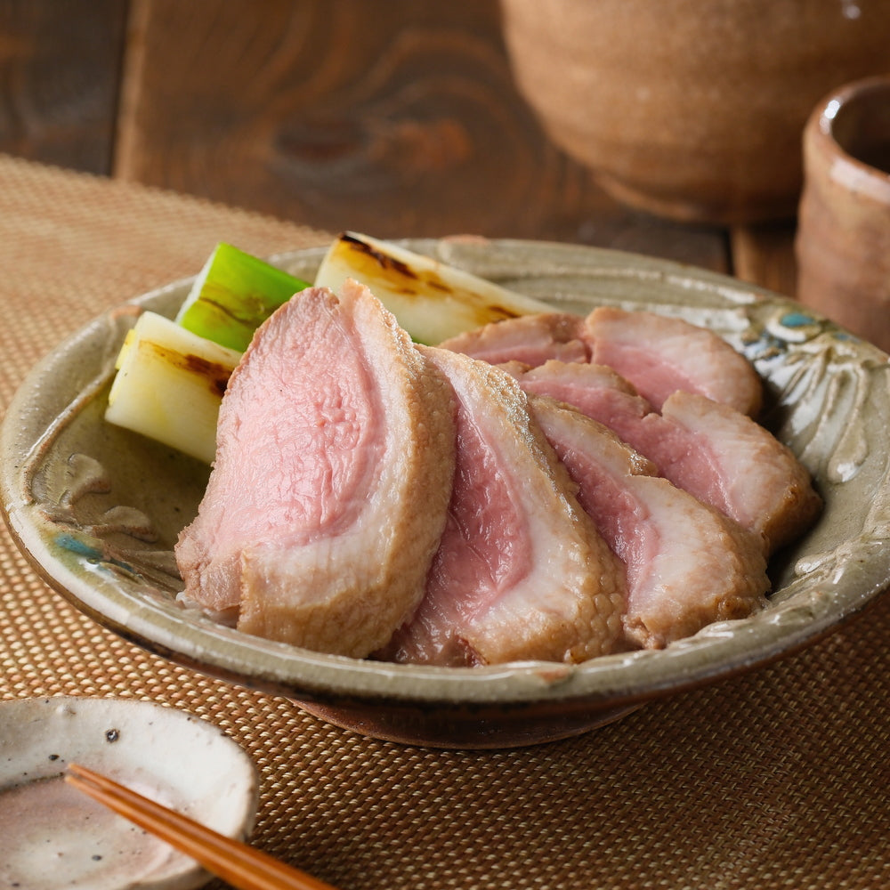 ■チェリバリー種の合鴨ロース肉を、オリジナルの薄味だしと合わせ軽く煮込みました。お肉の風味や食感を大切にし、限りなくレアな状態に仕上げた鴨煮です。解凍してお好みの厚さにスライスし、そのままお召しあがりください。
