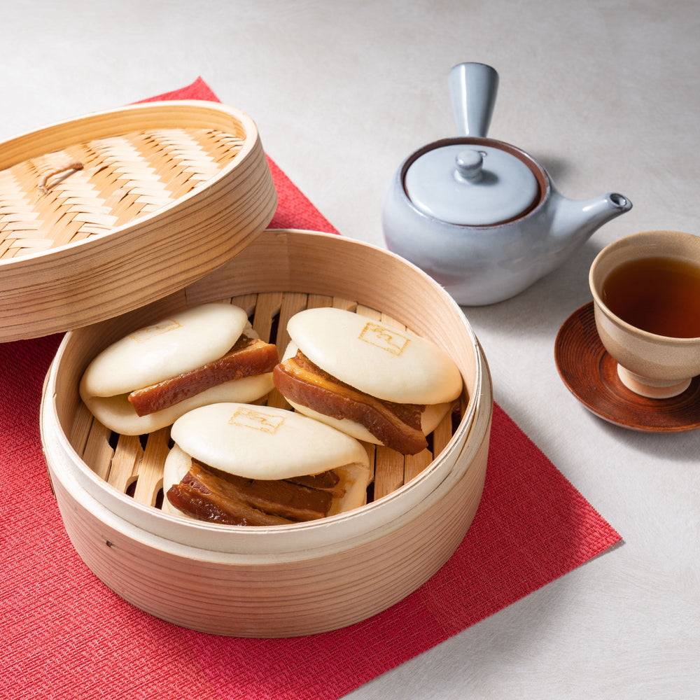 ■全国を訪ね歩き辿り着いた国産丸大豆しょうゆと、厳選した銘酒・みりん・砂糖・生姜をブレンドした秘伝のたれ。このたれで甘辛く煮込んだ伝統の角煮と2種類の国産小麦を独自に配合したまんじゅう生地のパオも自慢です。