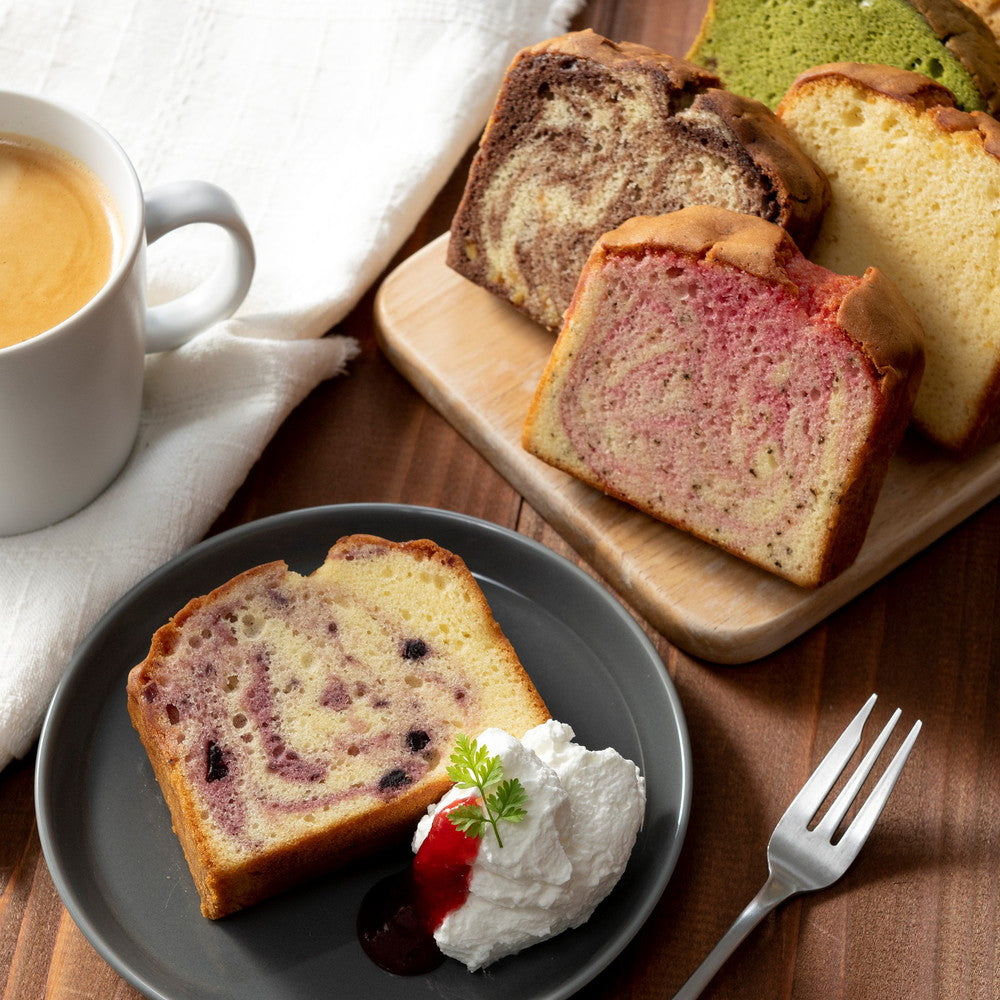 ■フルーツを混ぜ込んだ大きなしっとりパウンドケーキです。ずっしりとしたサイズ感ですが、ふんわり軽い食感で意外にぺろりと食べられます。朝食代わりやデザートにも。フルーツとフレーバーが組み合わさったそれぞれの味わいをお楽しみください。