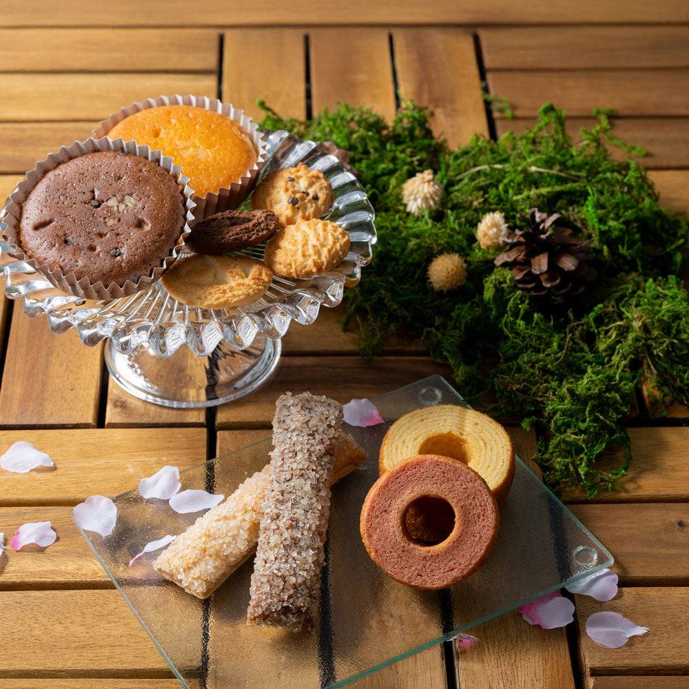 ■美しい森の中で、色とりどりの花たちと鳥たちがさえずる、森の詩のお菓子。切り株のしっとりバーム、森の枝のさくさくパイなど、森の詩を奏でる焼き菓子を、色鮮やかに描かれた不思議の森のデザインボックスに詰め込みました。受け取った瞬間に心の中に現れる癒しの場所と素朴で優しいスイーツをお届けします。