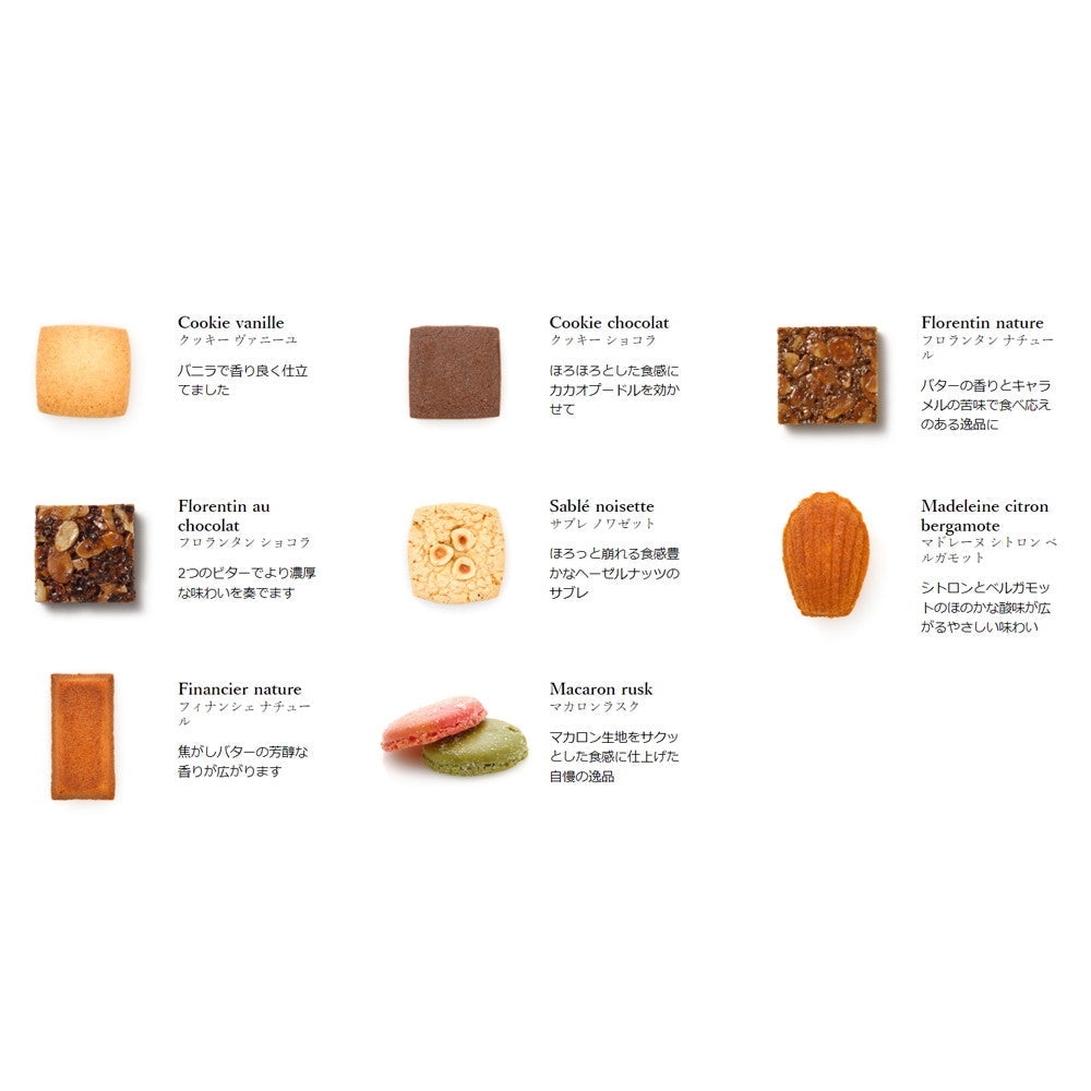 ■商品内容:クッキー(ヴァニーユ・ショコラ×各1)、フロランタン(ナチュール・ショコラ×各1)、サブレ ノワゼット×2、マドレーヌ シトロン ベルガモット、フィナンシェ ナチュール×各3、マカロン ラスク×8【11種類・20品目】