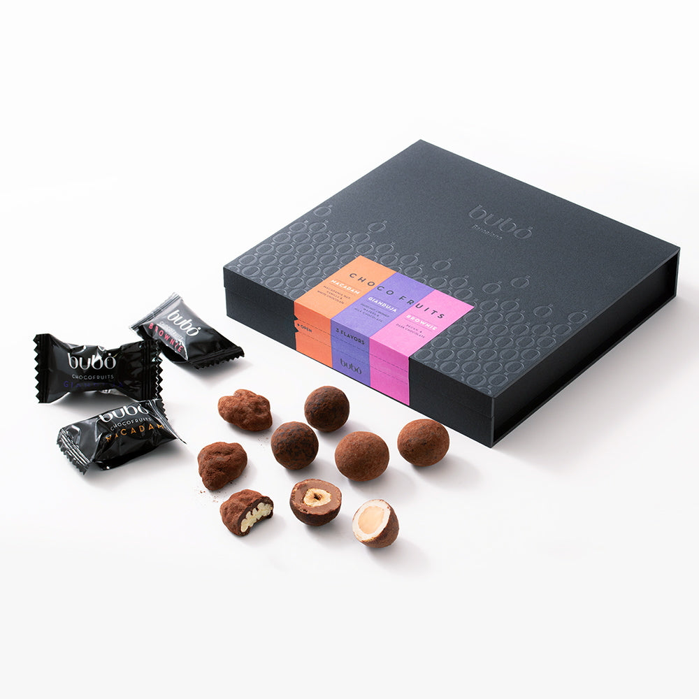 ■ブランドを代表するチョコレート「チョコフルーツ」を一粒ずつ贅沢に包んだアソートボックスです。スタイリッシュなボックスに、人気のフレーバー「マカダム」「ジャンドゥーヤ」「ブラウニー」の3種類を詰め合わせました。大粒のナッツをチョコレートでコーティングし、ナッツとチョコレートの絶妙なバランスが、やみつきになる逸品。贈り物やお手土産にもぴったりな一箱です。インターナショナルチョコレートアワード2020銀賞を受賞。(マカダム、ジャンドゥーヤ)