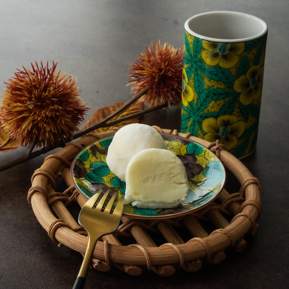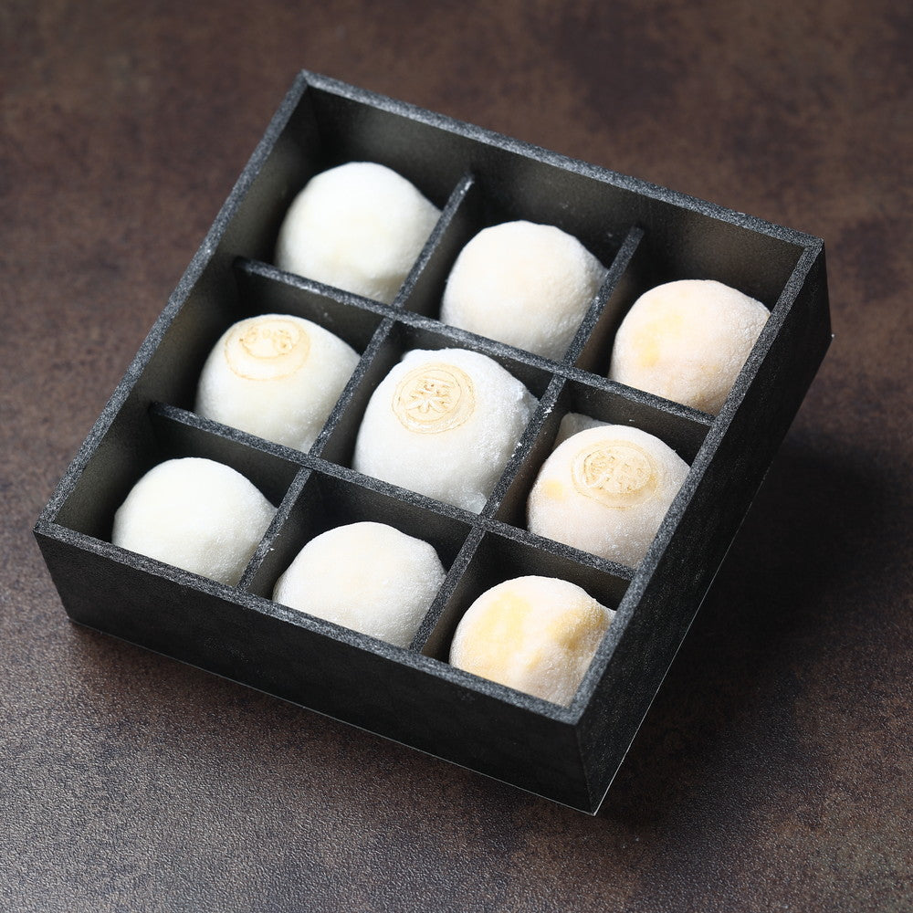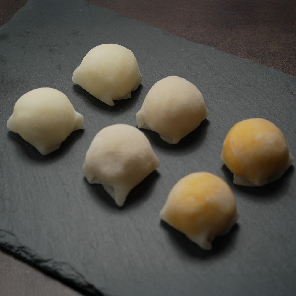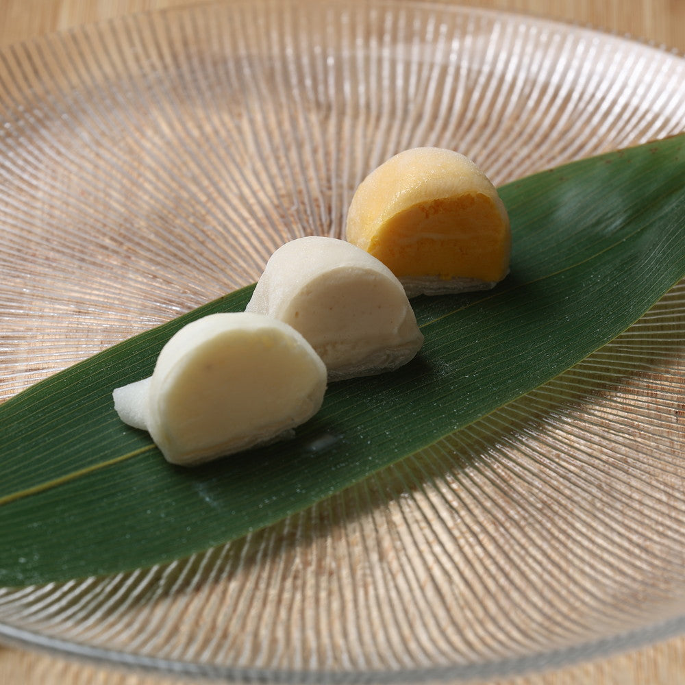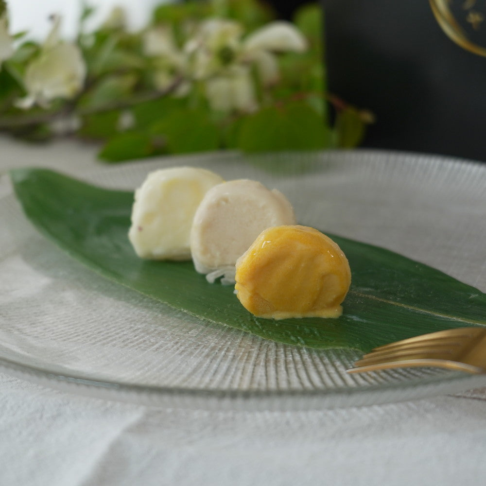 これら三種のジェラートを、口どけと厚みにこだわった特製求肥でひとつずつ丁寧に包みました。求肥は時間をかけて仕込み、食べた瞬間にふわりと溶ける柔らかさを実現しております。