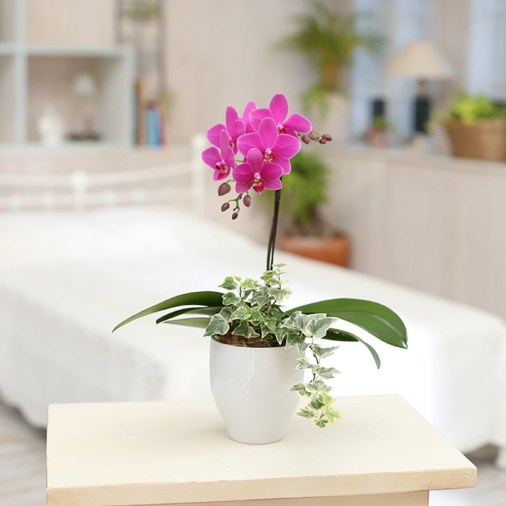 ミディ胡蝶蘭観葉寄せ(4.5号鉢1本立ち 濃ピンク)