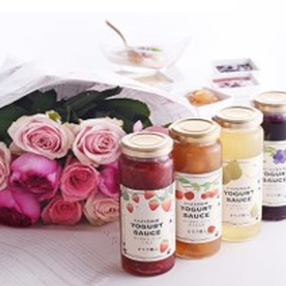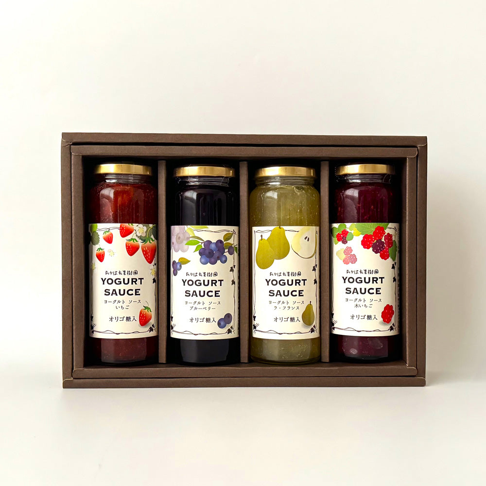 ■商品内容:山形 「たかはた果樹園」ヨーグルトソース(いちご、ブルーベーリー、ラ・フランス、木いちご)各種220g×4本セット