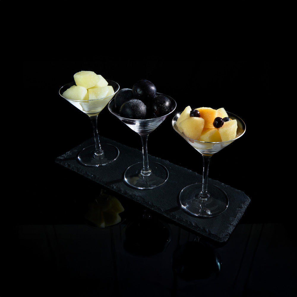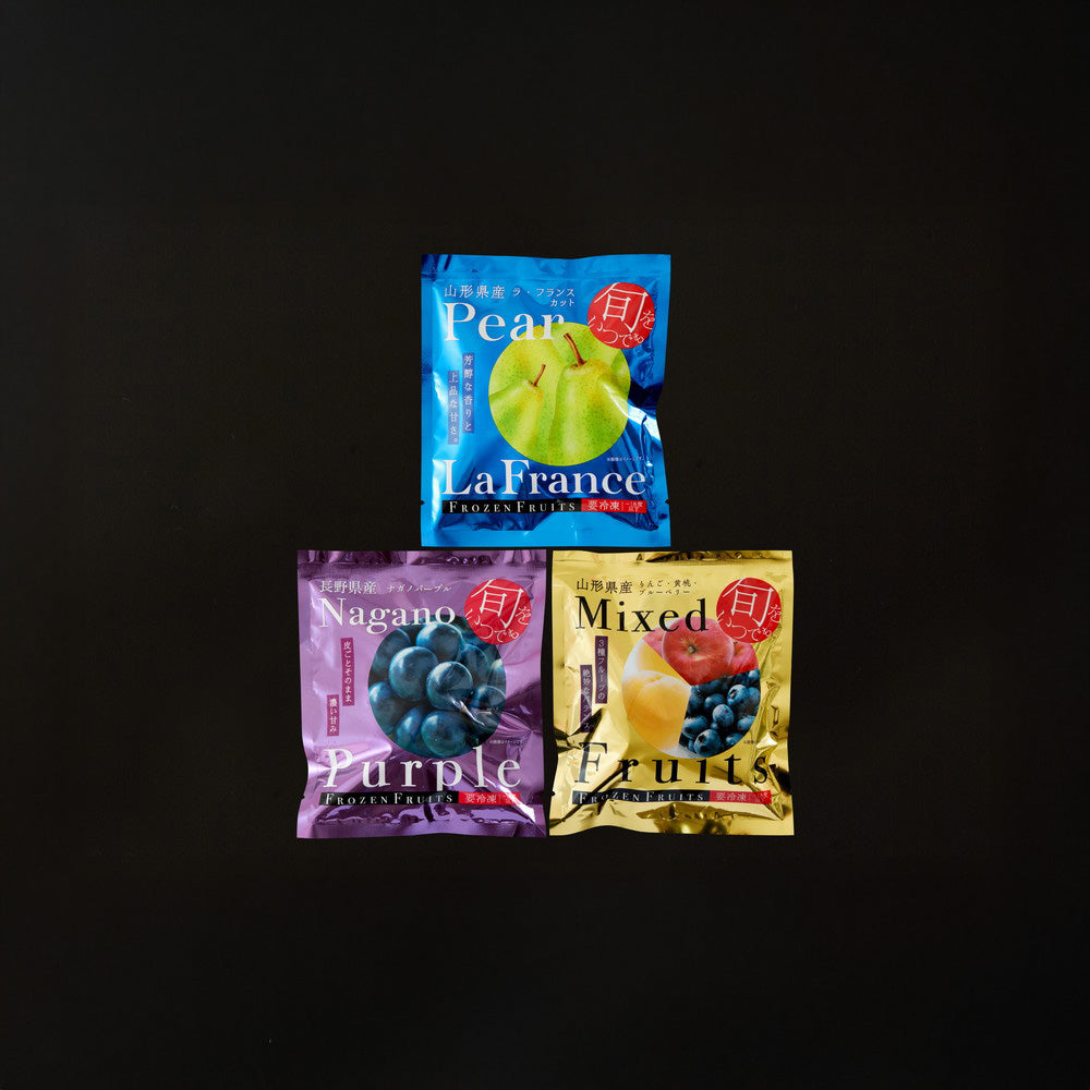 ■長野で育った深い紫色の美しい果皮のナガノパープルと、山形で育った歯触りのいい甘くてジューシーな洋ナシ、それとりんごと黄桃、ブルーベリーをミックスしたパックの3種を一番おいしい旬のタイミングで-30度の液体アルコールに漬けて凍眠冷凍しました。半解凍でシャーベットでお召し上がりいただくほか、ジュースやお酒の氷の代わりとして、スムージーやデザートのトッピングなど、フルーツ本来の香りや甘さをお楽しみください。