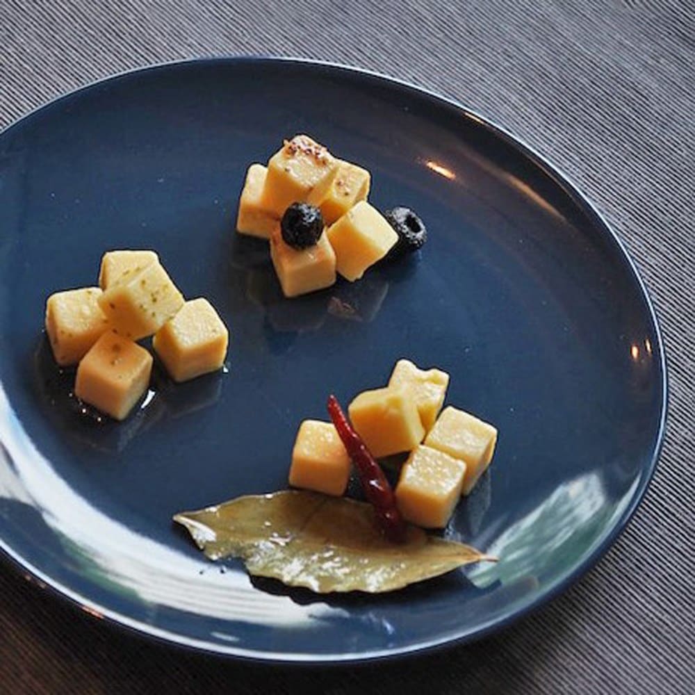 自社農園バジル入りのオリーブオイルにキューブ型のチーズを漬込みました。チーズはおつまみで、残ったオイルはサラダやパスタにお使い頂けます。