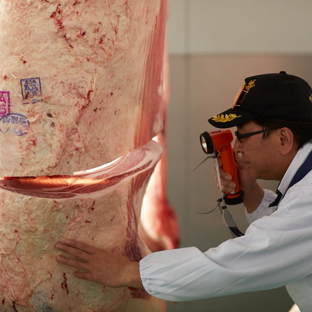 セリにかけられた枝肉(一頭分の肉)の中から、本当に良いものだけを長年の経験で培った目利きの技術で選びます。