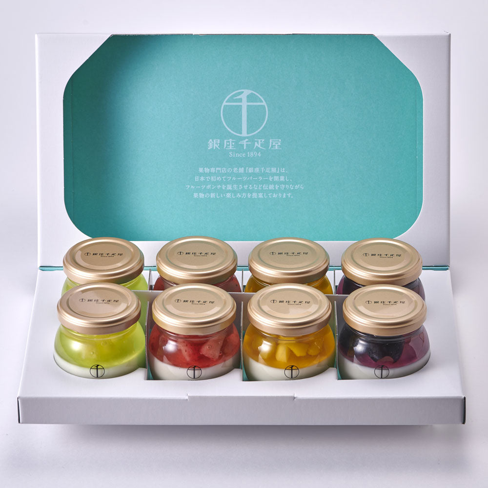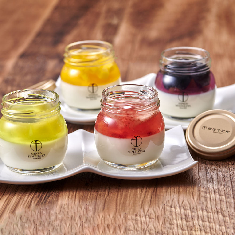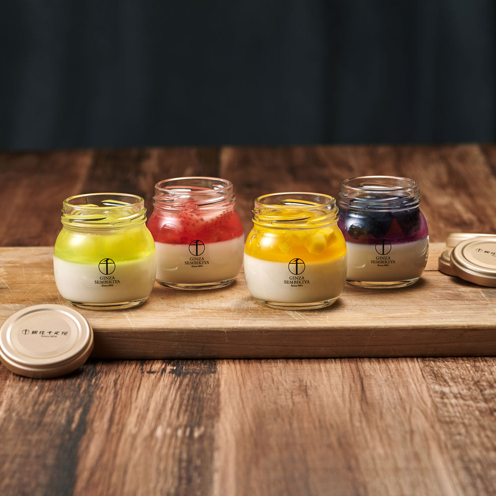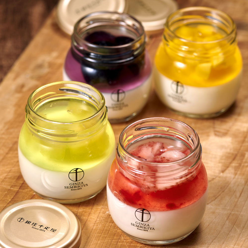 ■フレッシュな果物を使用した4種類のフルーツゼリーと口当たりなめらかな杏仁豆腐を瓶に閉じ込めました。