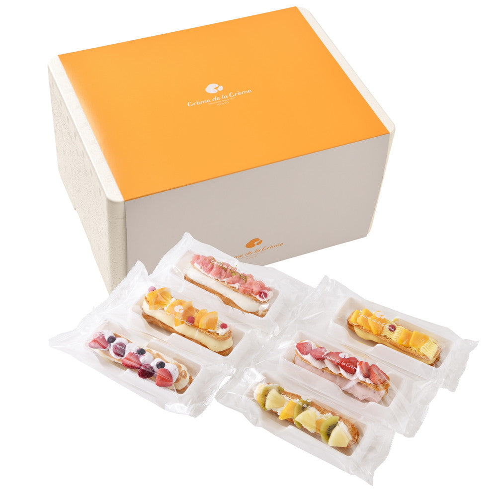 ■シュークリーム専門店「クレーム デ ラ クレーム」がお届けするエクレアタイプのシューアイス。フルーツや彩り鮮やかなクリームで華やかに飾りつけたまるでデコレーションケーキの様なシューアイスです。