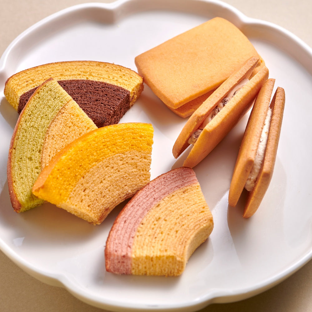 ■一層一層丁寧に焼き上げた生地と、果汁を加えて仕上げた生地の2つの味が絶妙なハーモニーの「フルーツクーヘン」 。なめらかで口当たりのやさしいフルーツクリームと香り豊かな果汁を香ばしいクッキーでサンドした「フルーツサンド」の詰合せです。