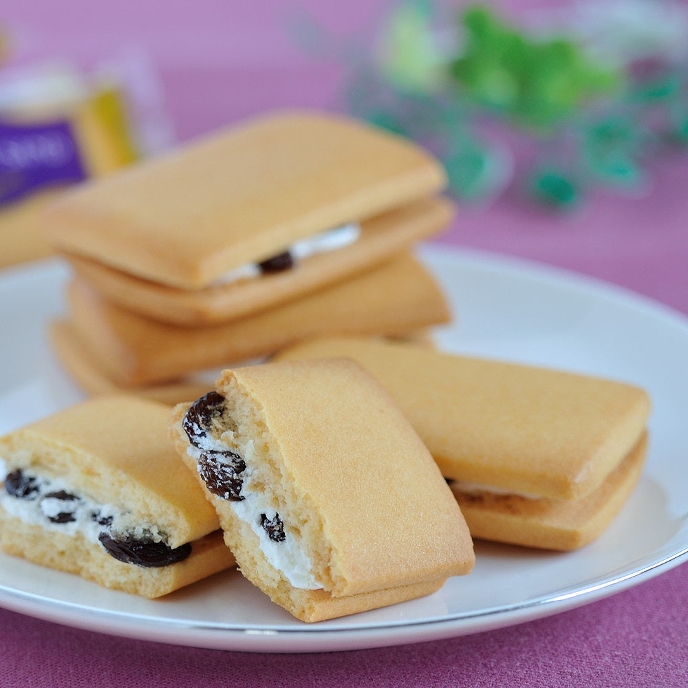 ■良質のマーガリンとアーモンドプードルをふんだんに練りこんだ生地にアーモンドスライスをトッピングしてサクッと焼き上げたクッキー生地でリキュールのさわやかな香りのクリームとラム酒に漬けこんだレーズンをたっぷりサンドした。贅沢な味わい深いレーズンサンドです。