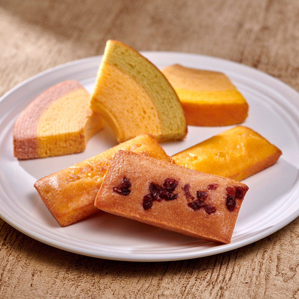 ■一層一層丁寧に焼き上げた生地と、果汁を加えて仕上げた生地の2つの味が絶妙なハーモニーの「フルーツクーヘン」。バターとアーモンドプードル、フルーツのピューレで焼き上げた「フルーツフィナンシェ」を詰合せました。