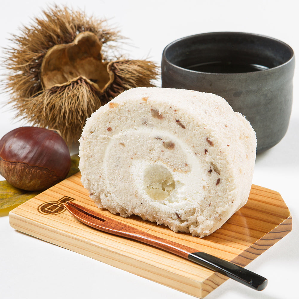 ■【渋皮栗入栗きんとんロール】渋皮栗を贅沢に散りばめた生地で栗きんとんとクリームを巻いた栗をふんだんに使用したロールケーキです。しっとりとした弾力がありながら、ふわふわの食感の生地。栗を存分に使用した栗専門店ならではの渋皮入栗きんとんロール。