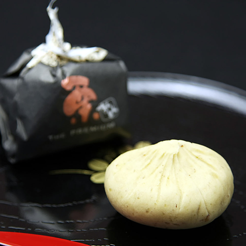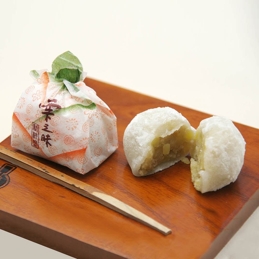 【粒栗三昧】栗きんとんの餡は、2016年モンドセレクション金賞受賞の国産100%にこだわった栗きんとんを使用。その餡をやわらかなお餅で丁寧に包み込みました。