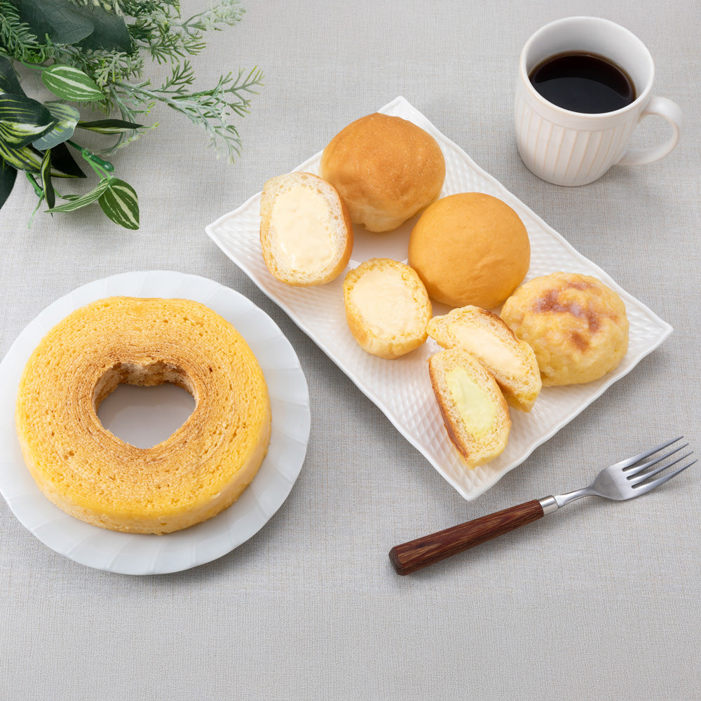 ■商品内容:くりーむパンカスタード×2、塩バターくりーむパン×2、くりーむメロンパン(カスタード×1、メロン×1)、バームクーヘン×1