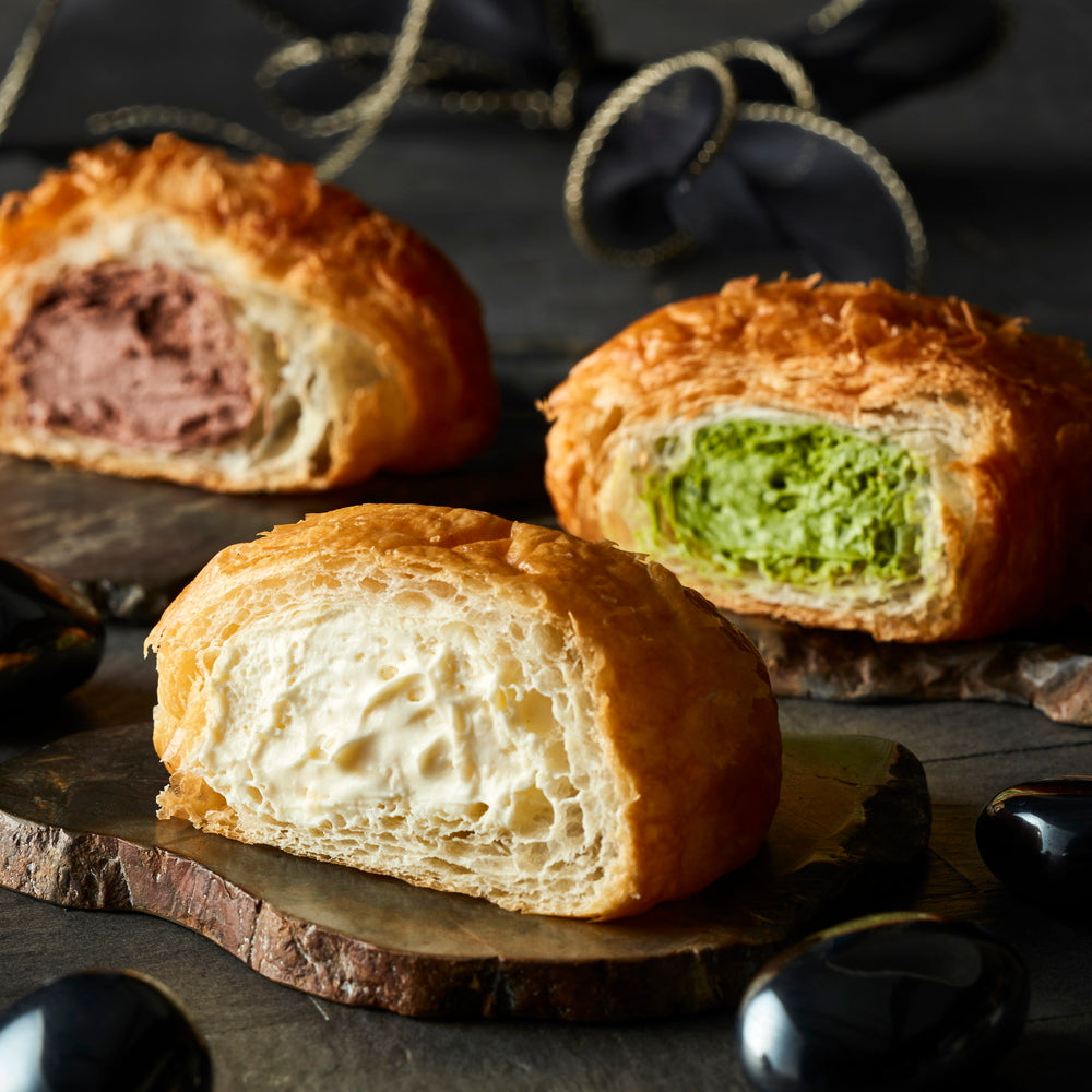 ■焼き上げたクロワッサンに蔵家オリジナルクリームを入れたスイーツ感覚の生クリームパンです。甘さ控えめ一番人気のカスタード、ココア風味の濃厚で香ばしいチョコクリーム、濃厚で甘さ控えめでほろ苦い風味の抹茶クリームの3種類をセットでお届けいたします。たっぷり入った濃厚なクリームとクロワッサンの食感お楽しみいただけます。