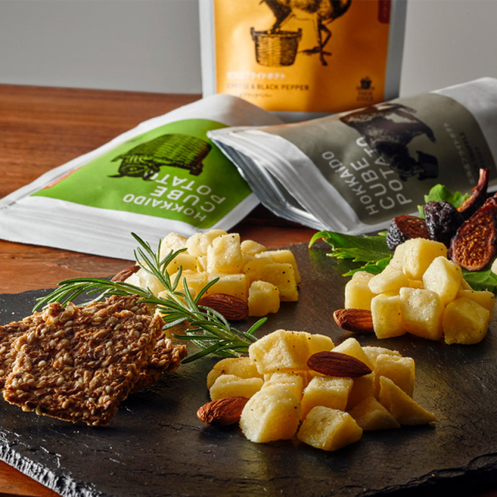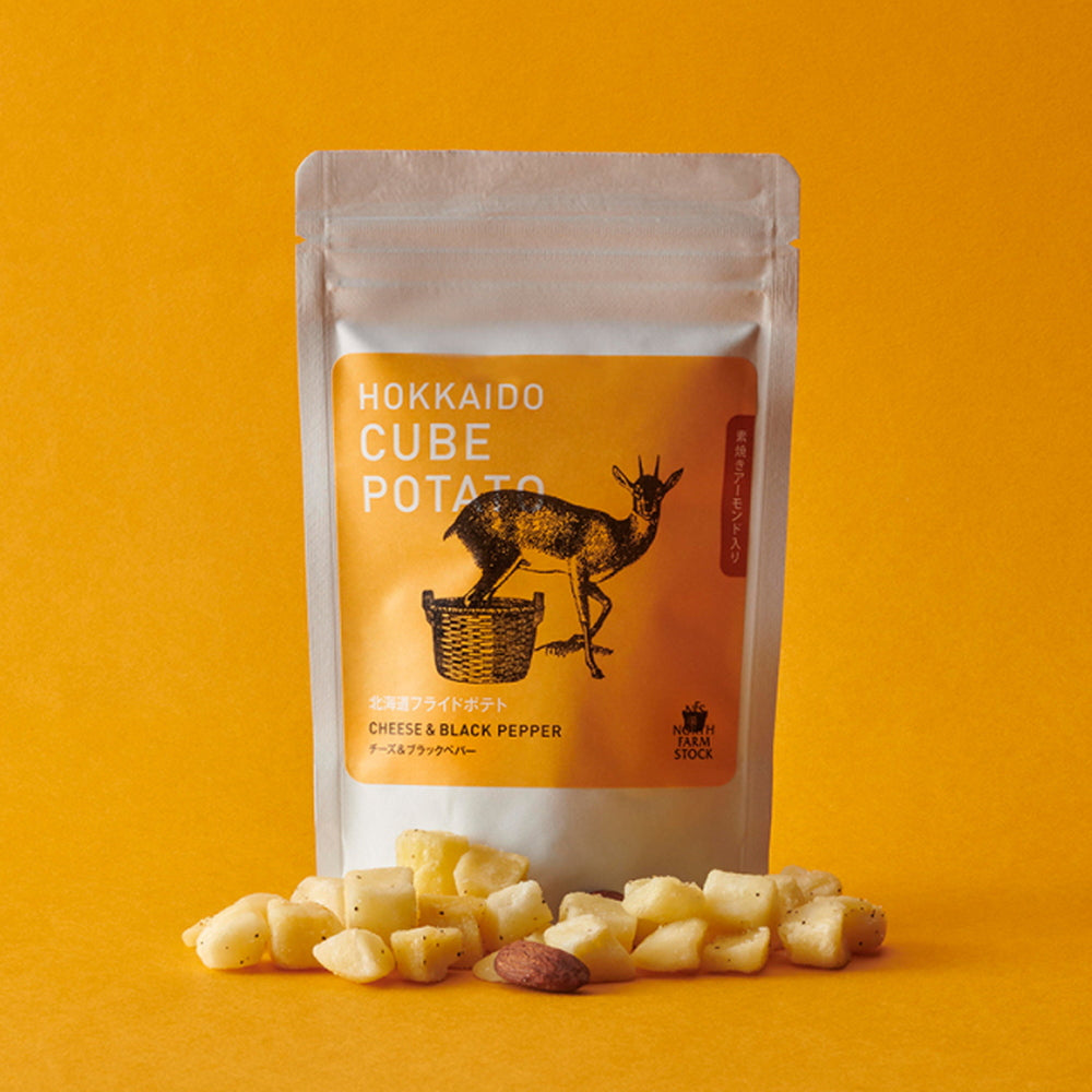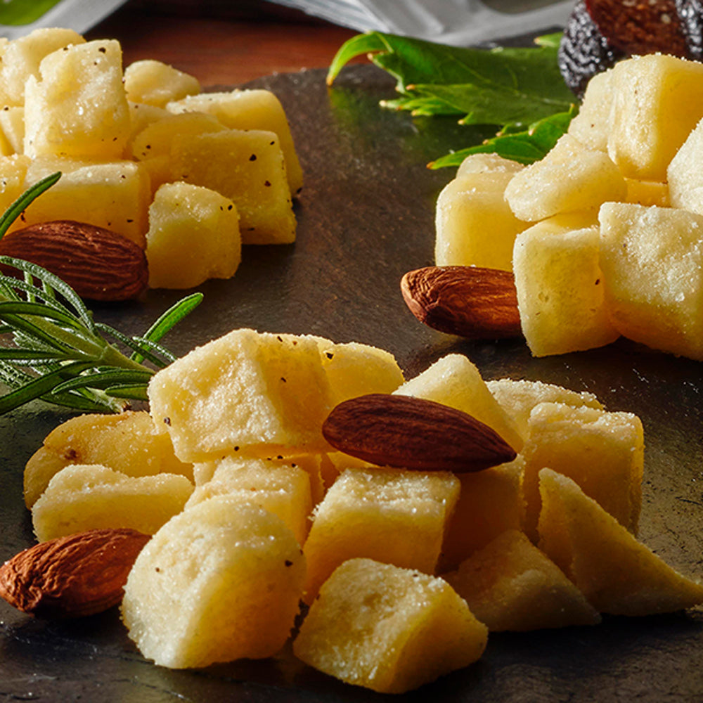【素焼きアーモンド入り】北海道産のじゃがいもを100%使用したキューブ型フライドポテト。真空低温製法でじゃがいも本来の旨味をお楽しみいただけます。おやつやワインのお供にもオススメです。"チーズ&ブラックペパー"は、マイルドなパルメザンチーズの風味と黒胡椒のスパイシーな味わいがクセになるテイストです。