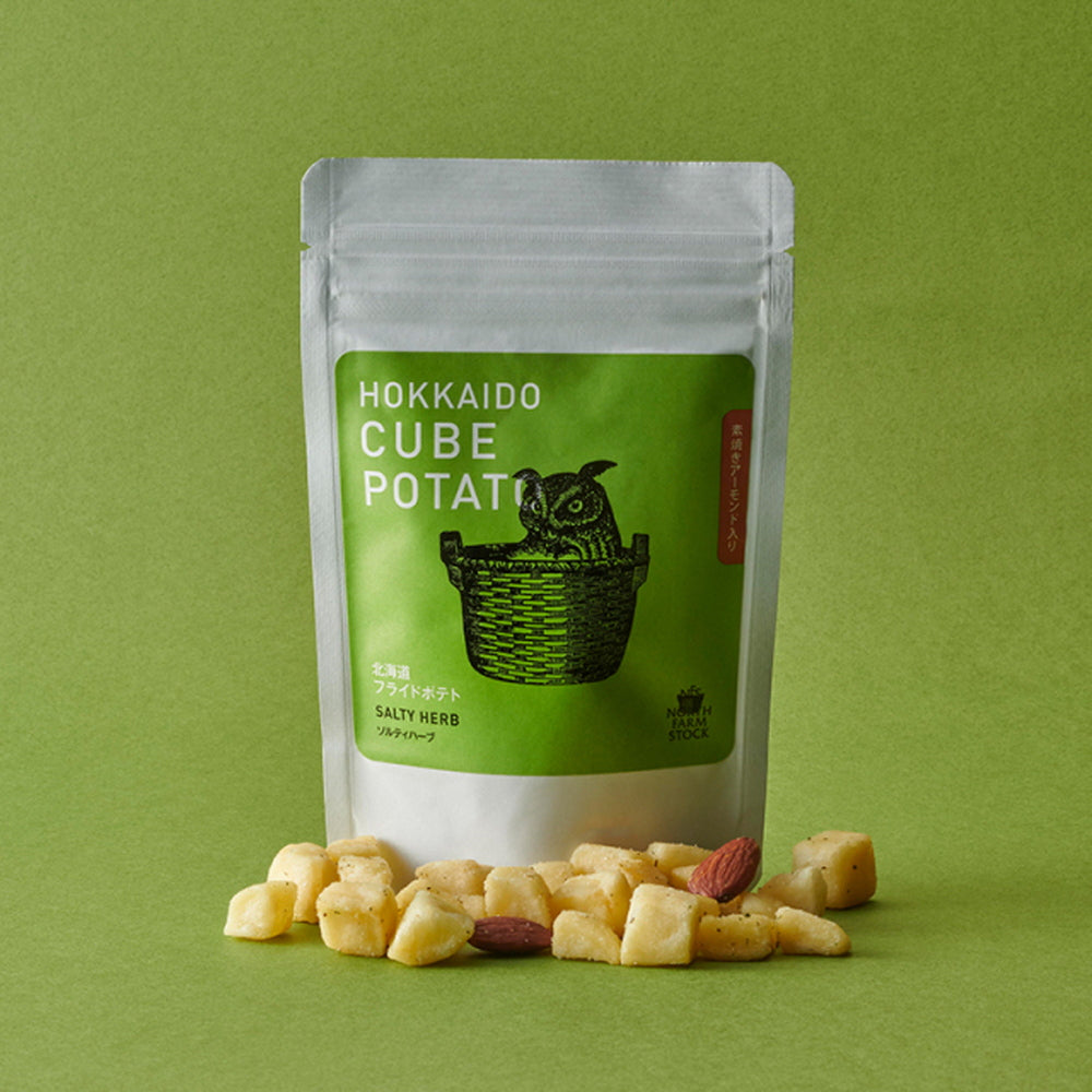 【素焼きアーモンド入り】北海道産のじゃがいもを100%使用したキューブ型フライドポテト。真空低温製法でじゃがいも本来の旨味をお楽しみいただけます。おやつやワインのお供にもオススメです。"ソルティハーブ"は、ローズマリー、タイム、オレガノ、3種のハーブの香りと、ドイツ製岩塩のマイルドな塩気が特徴です。
