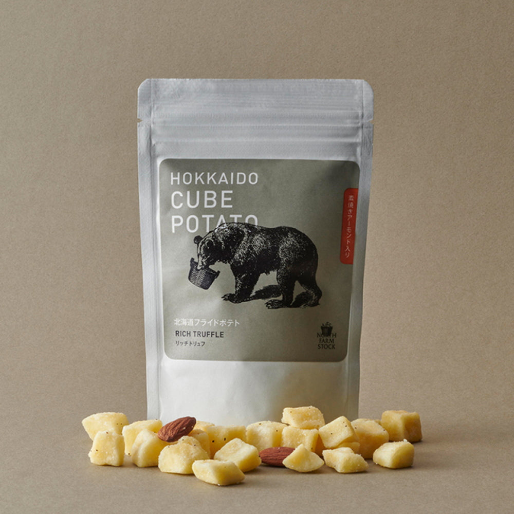 【素焼きアーモンド入り】北海道産のじゃがいもを100%使用したキューブ型フライドポテト。真空低温製法でじゃがいも本来の旨味をお楽しみいただけます。おやつやワインのお供にもオススメです。"リッチトリュフ"は、贅沢感のあるトリュフの芳醇な香りが特徴です。