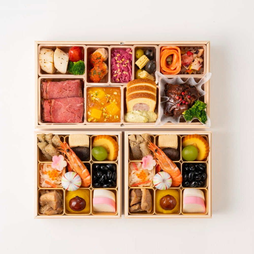 日本の伝統の品目を詰め込んだ小さな和の銘々重に、豪華な洋風オードブルをセットしました。大ぶりのローストビーフやホタテのコンフィなどを彩華やかに盛り付けております。