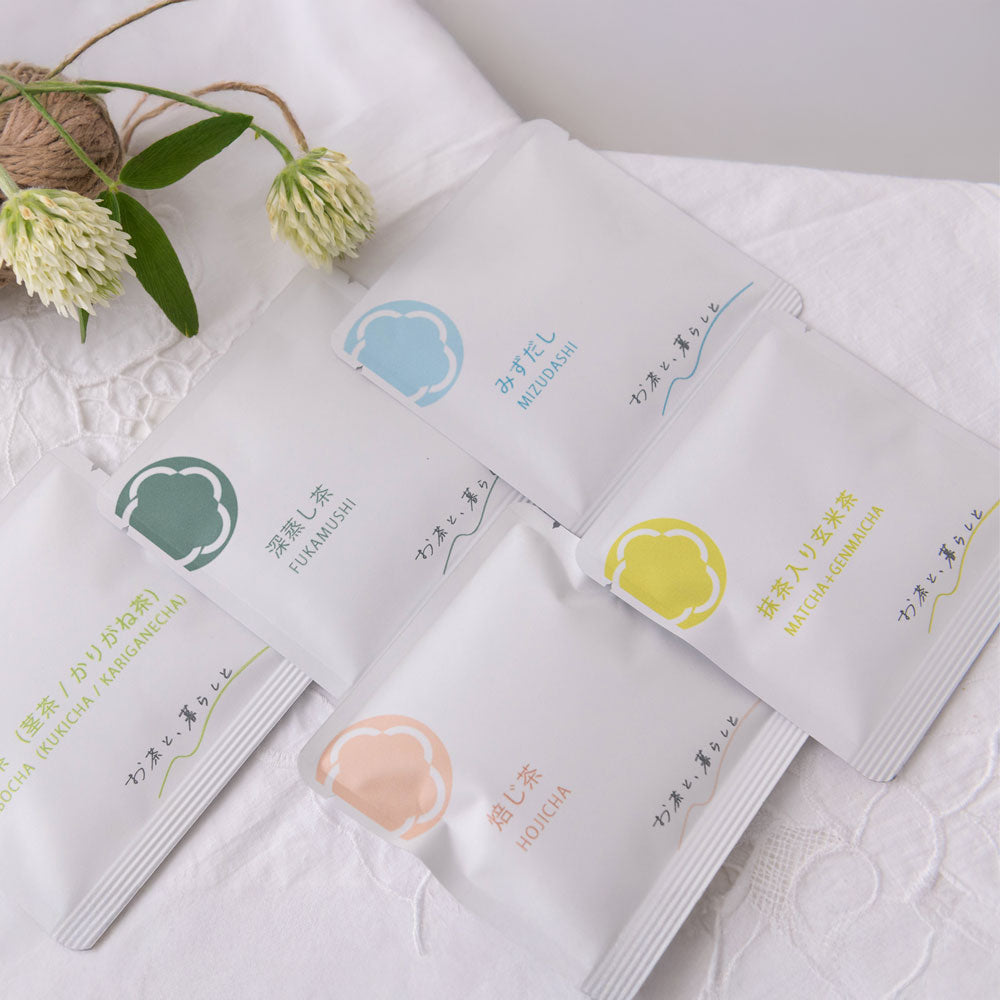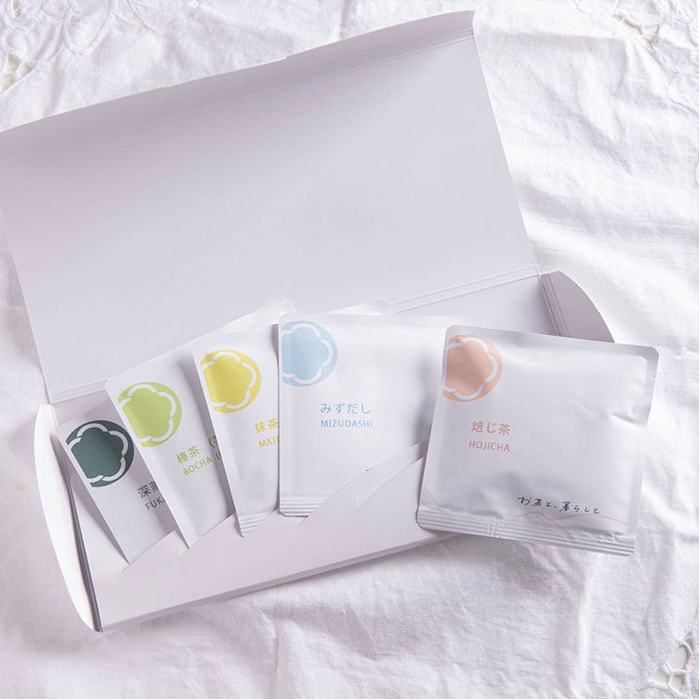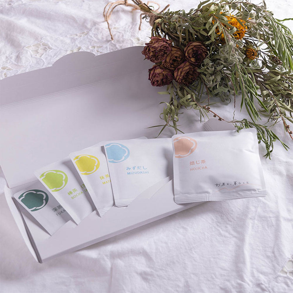 ■商品内容:お茶と、暮らしと 5種飲み比べ テイスティングセット リーフ(深蒸し茶10g、棒茶10g、みずだし10g、抹茶入り玄米茶10g、ほうじ茶7g)