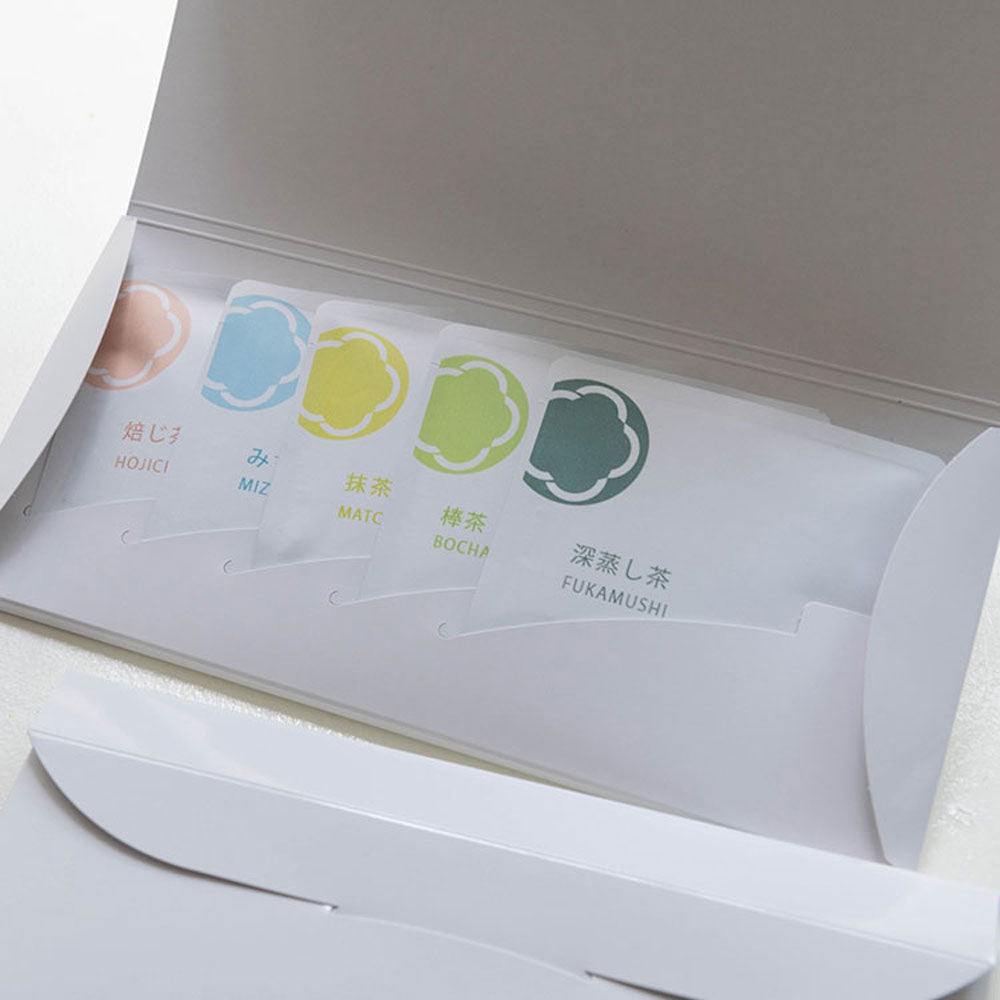 ■深蒸し茶、棒茶、みずだし、抹茶入り玄米茶、ほうじ茶、五種の茶葉のテイスティングセットです。
