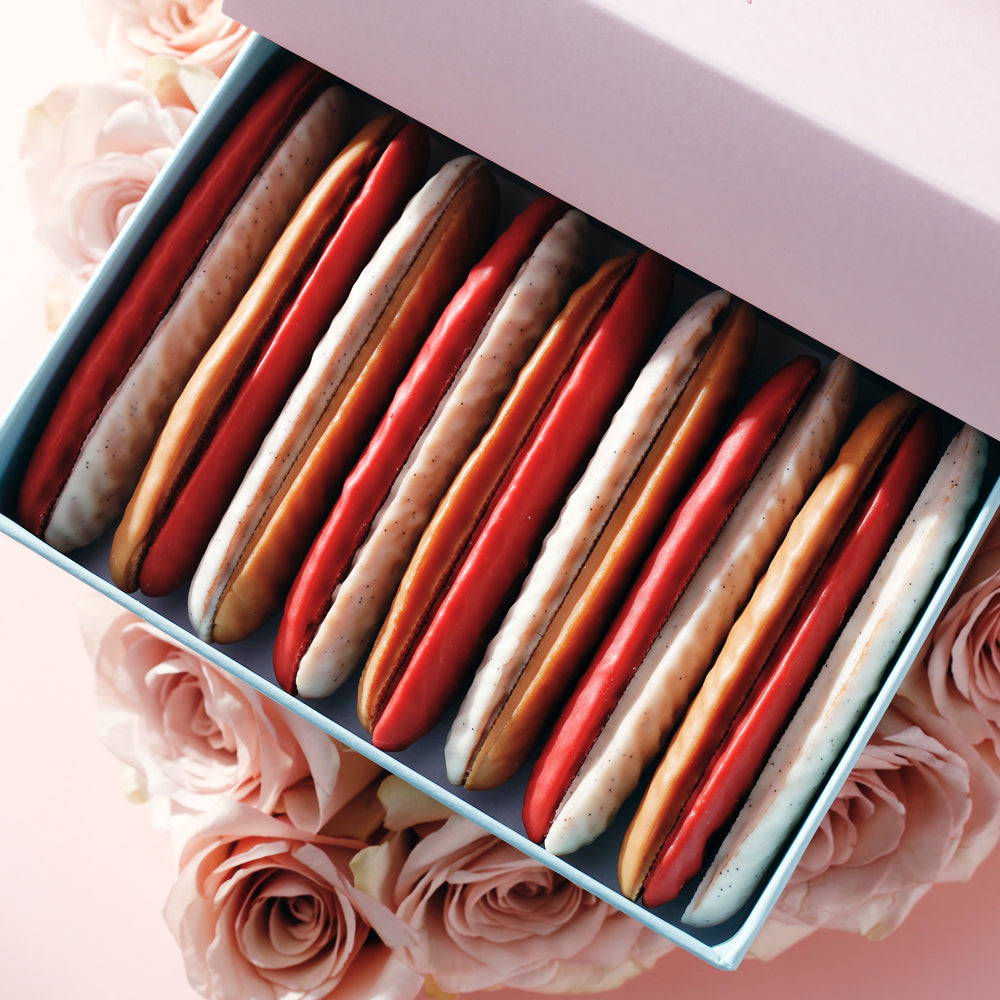 ■ラング・ド・シャとはフランス語で「猫の舌」。猫の舌をかたどったサクサクのビスキュイを、バニラ、キャラメル、イチゴの3つのフレーバーのホワイトチョコレートでコーティング。