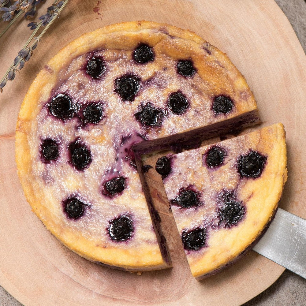 ■コンフィチュールにしたわかさ生活さんのブルーベリーを、チーズケーキ生地にマーブル状にまぜこみました。 ブルーベリーとチーズのコントラストをお楽しみください。