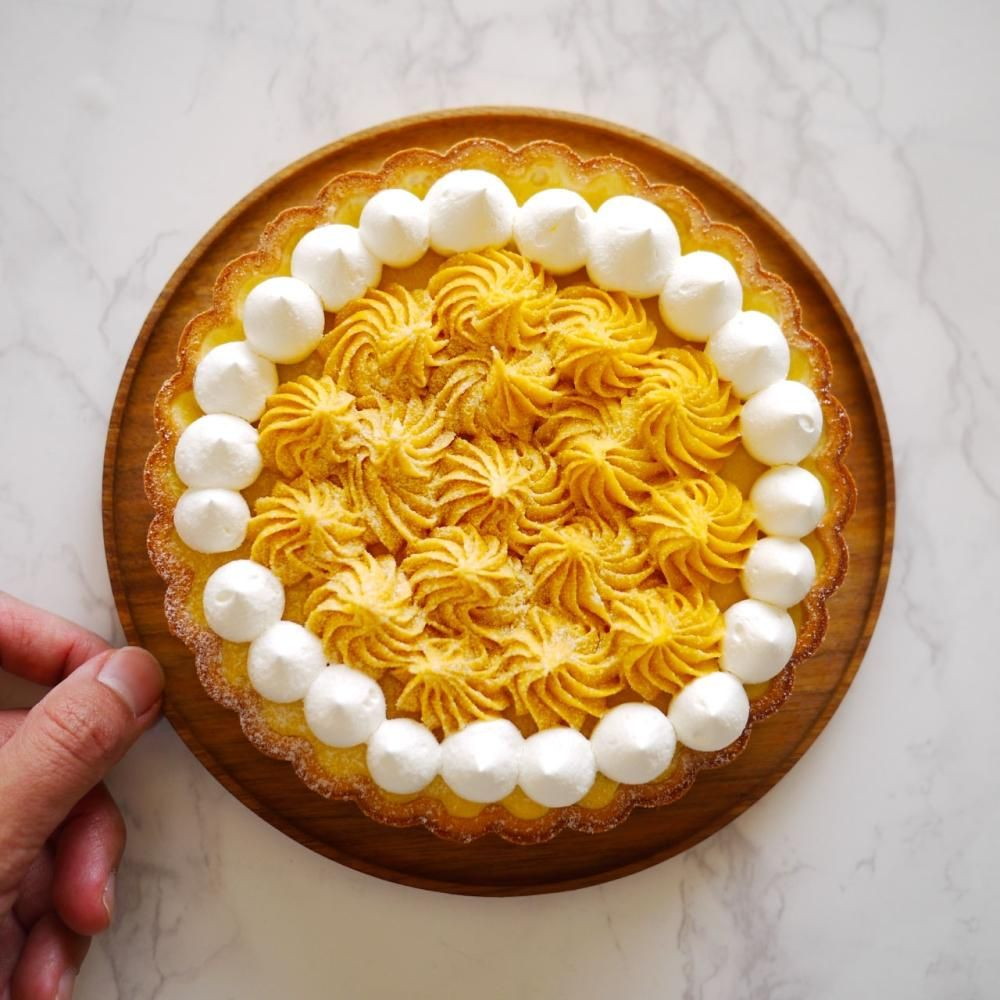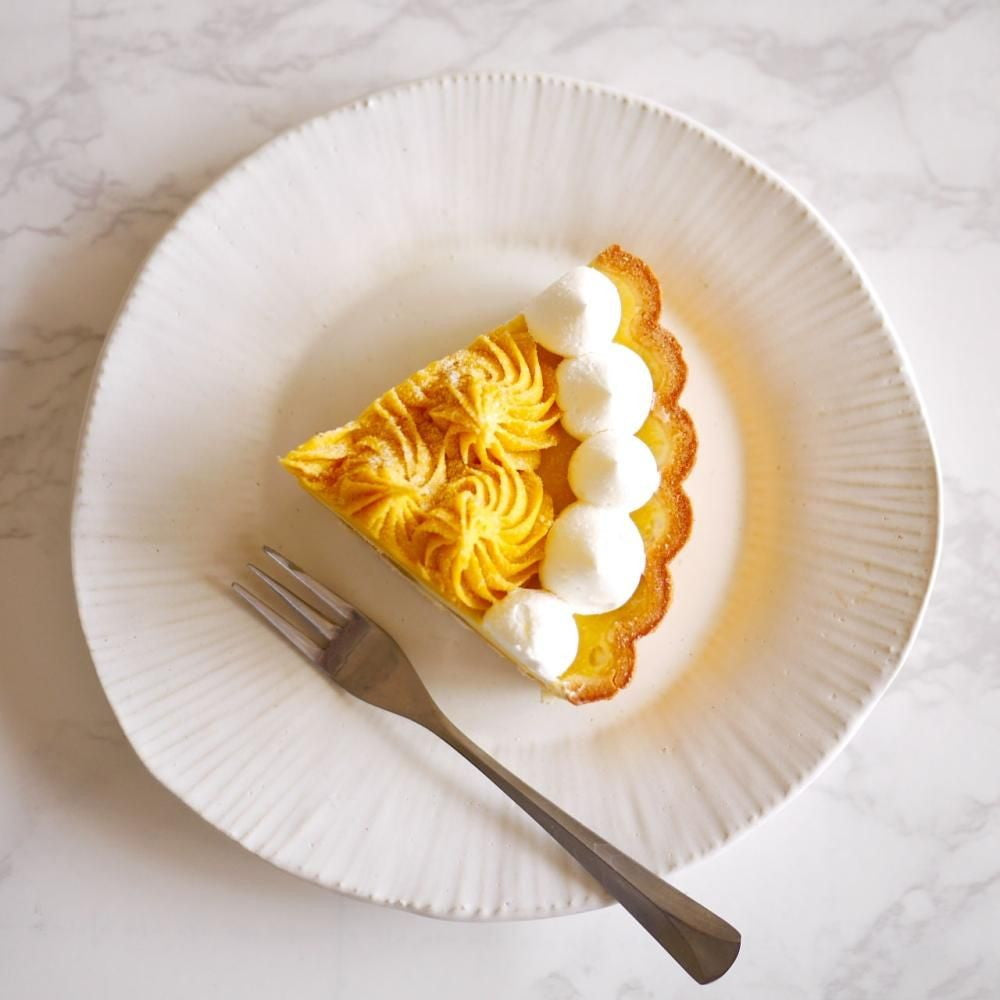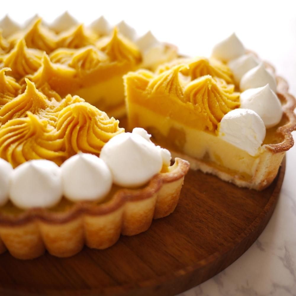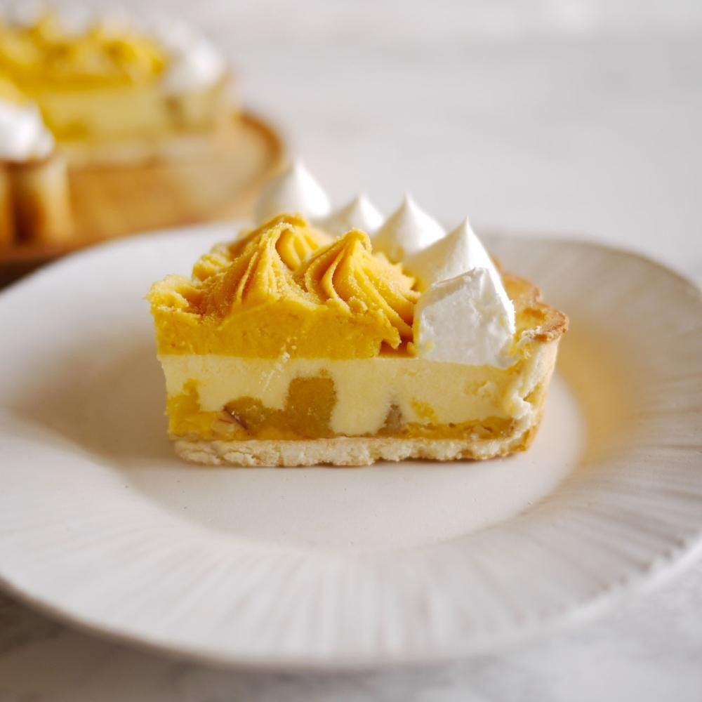 ■お芋づくしの贅沢タルトです。濃厚なめらか、とろけるお芋のムースとクリームで5層仕立てに仕上げました。サクサククッキータルトやアーモンドダイス、ホイップクリームなど、異なる食感や風味をさつまいもに合わせることでペロリとお召し上がりいただけます。
