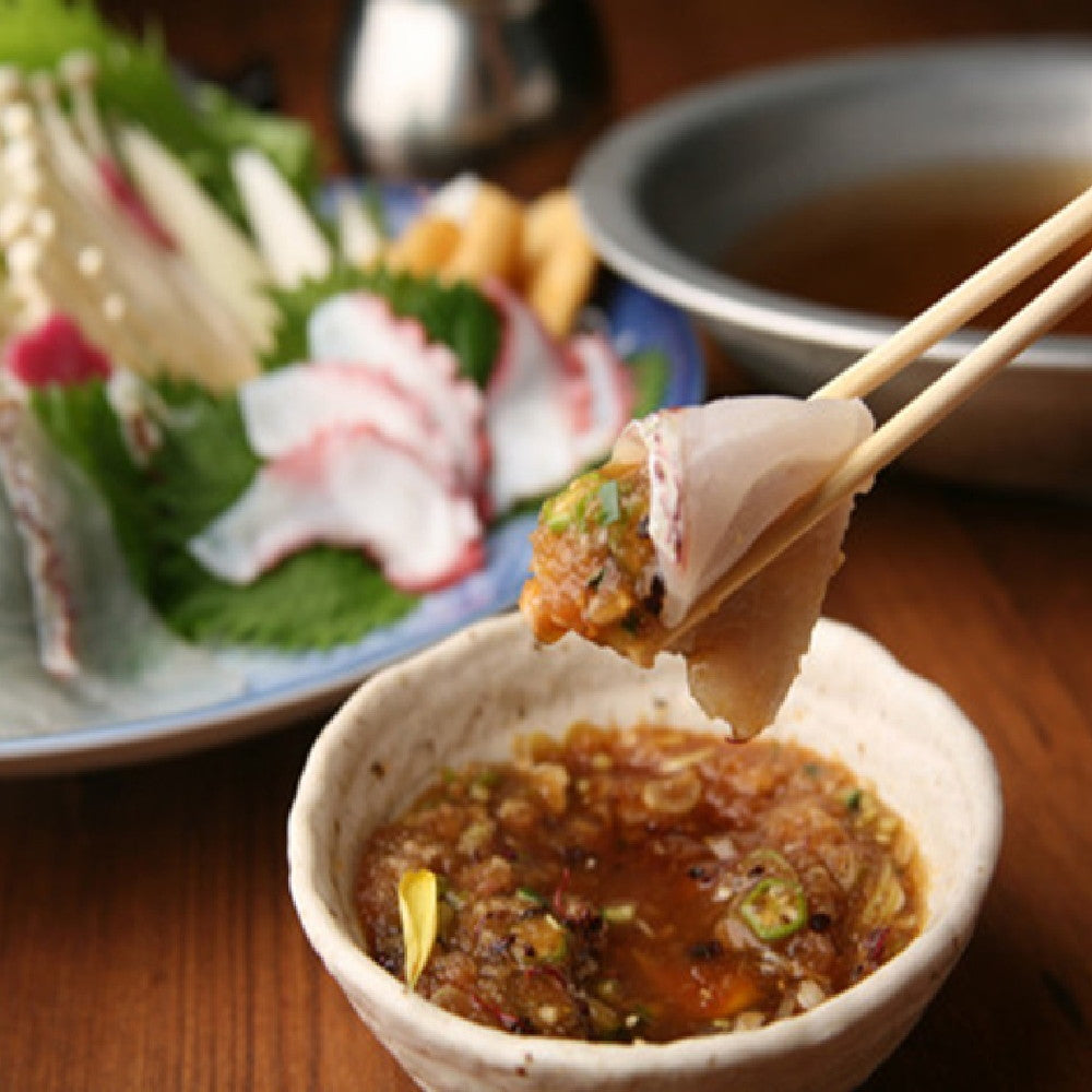 ■出汁でしゃぶしゃぶした天然のあわびや真鯛やふぐやたこを、野菜などといっしょに、さっぱりとぽん酢でお召し上がりください。